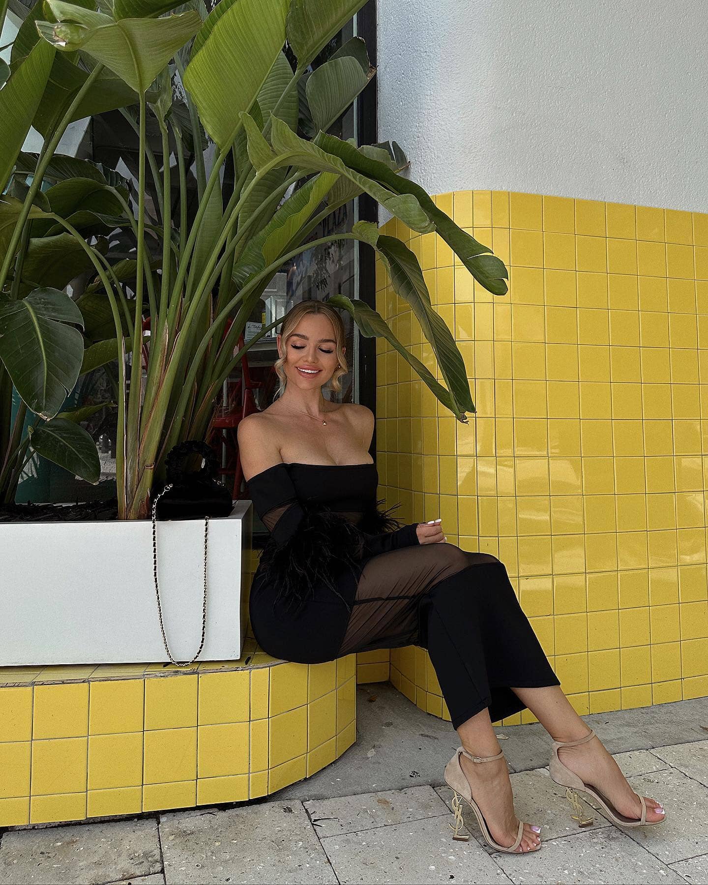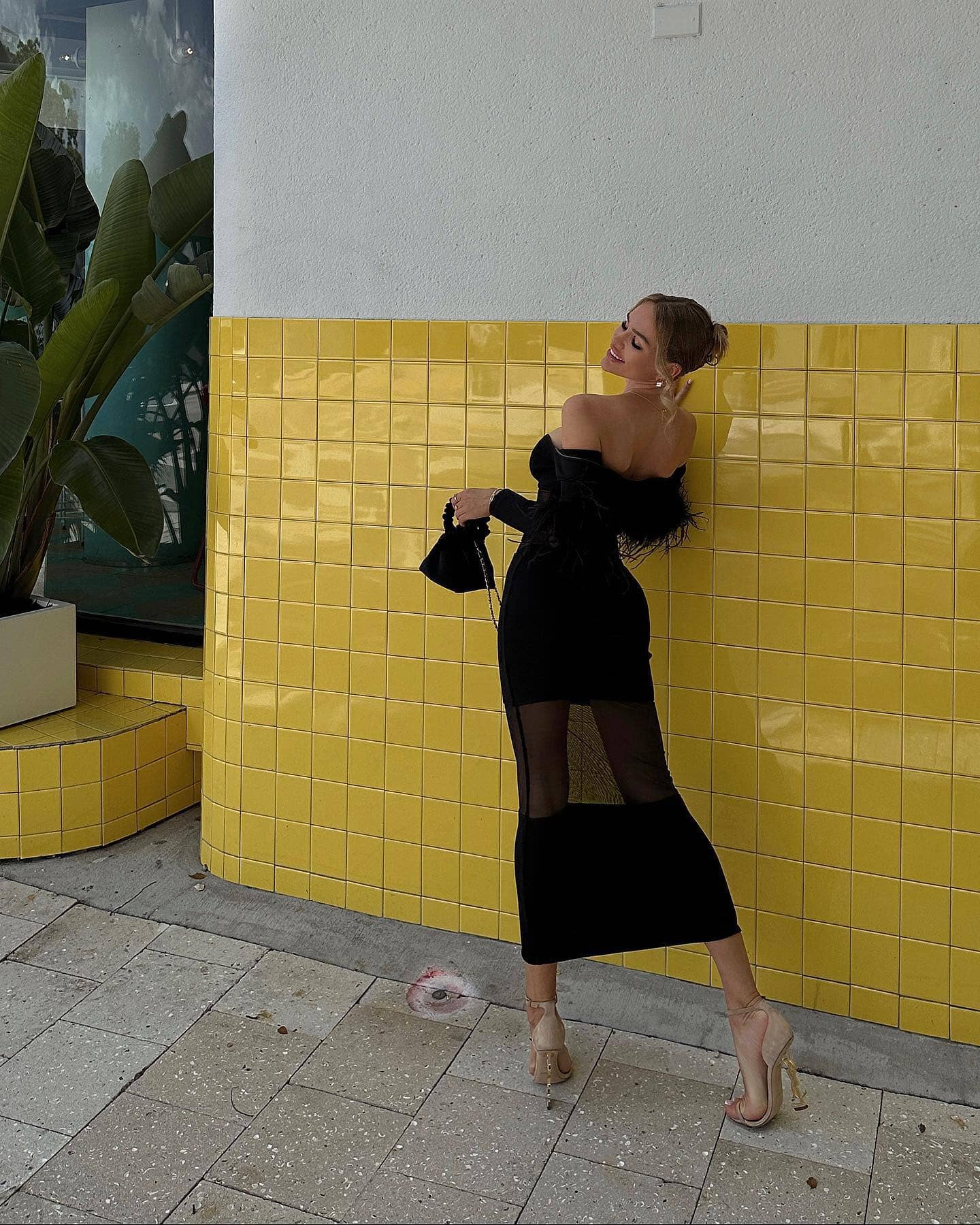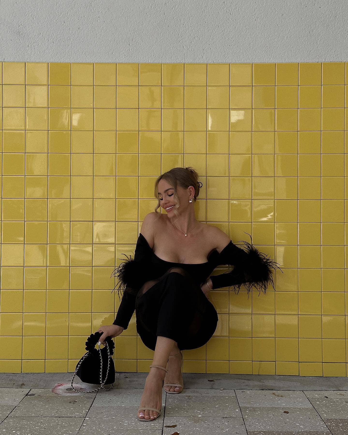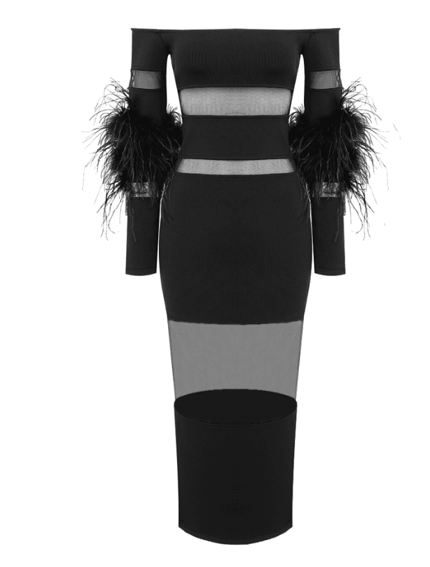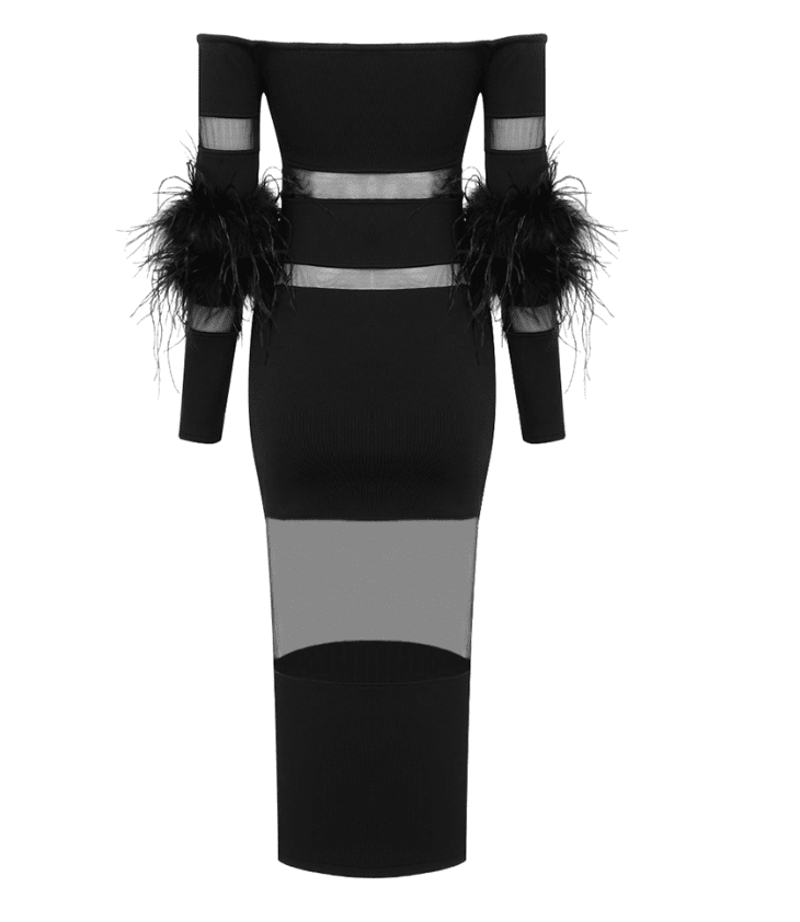 Make a statement in the Amaka Black Midi Dress, with luxurious touches of elegant mesh detailing and stylishly embellished feathers on the sleeves. Perfectly tailored for a sophisticated silhouette, this dress is sure to make an exclusive impression.