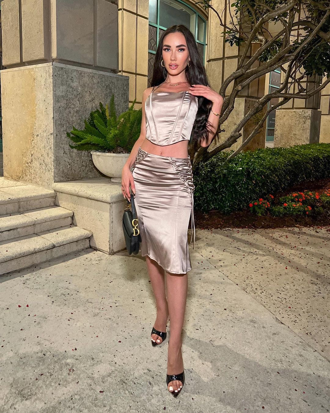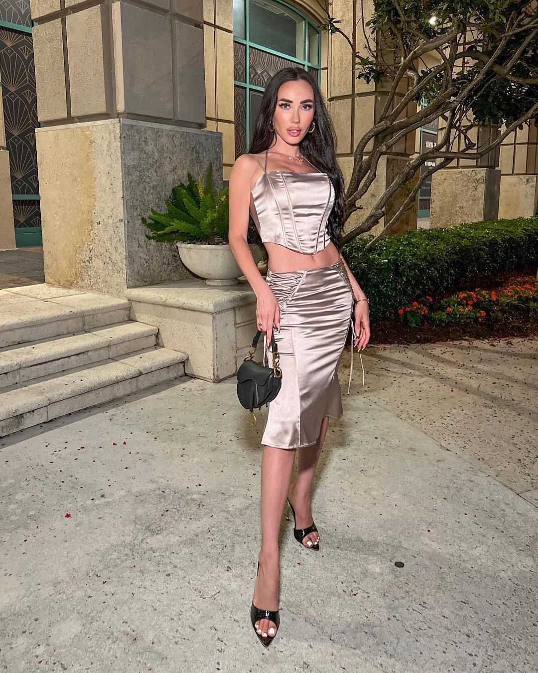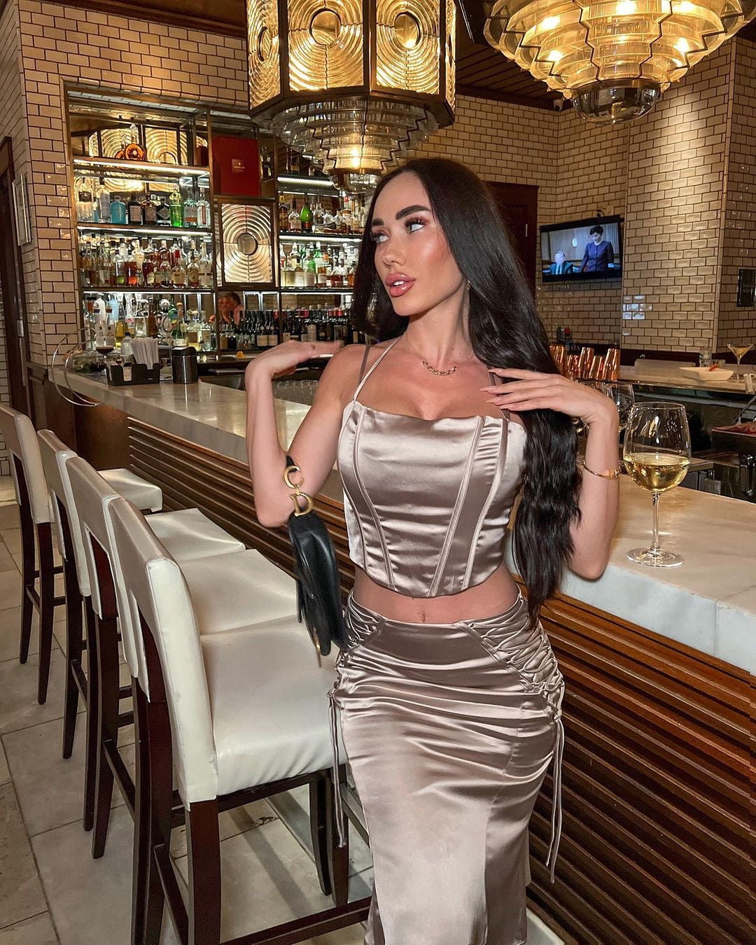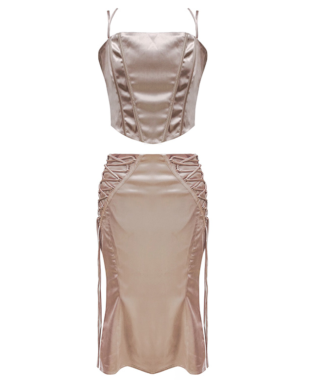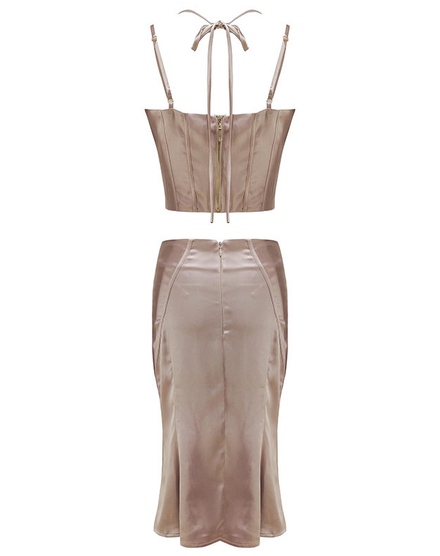 Our Anarely Two Piece Set comes in a stunning satin fabric! This set consists of a fitted halter crop top and a matching skirt Style with heels for a sexy look!