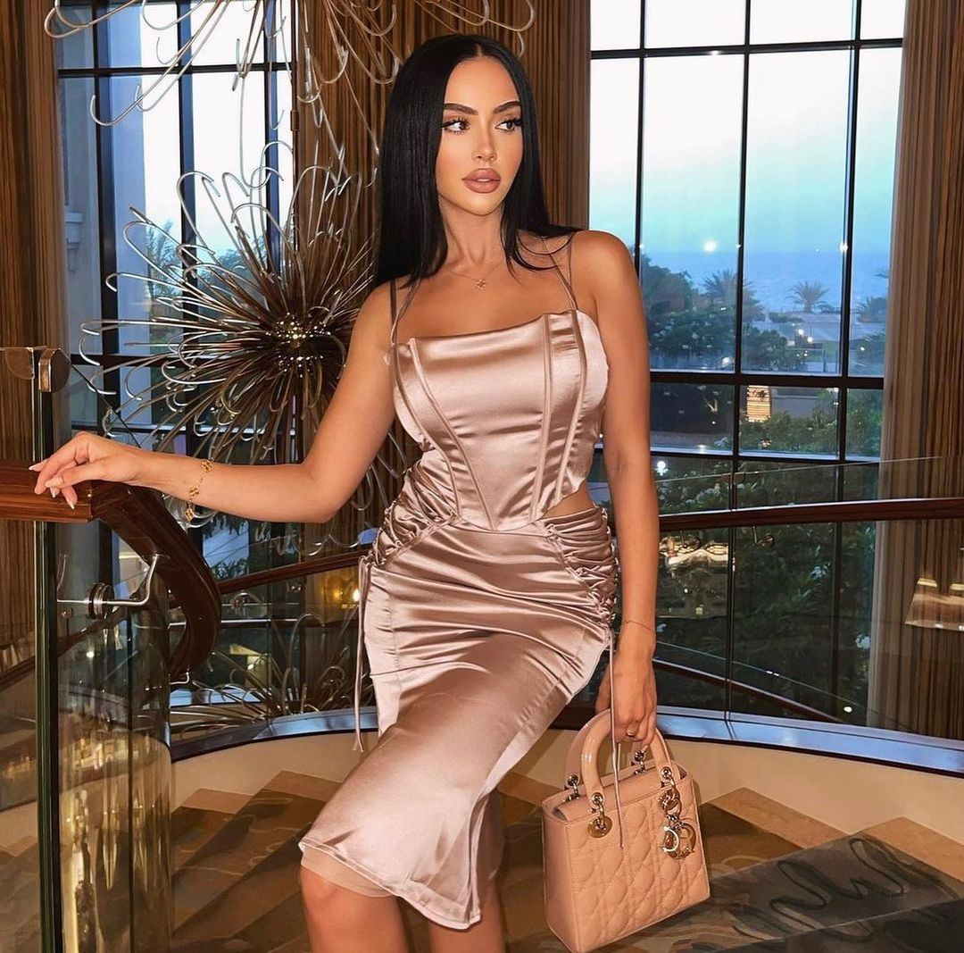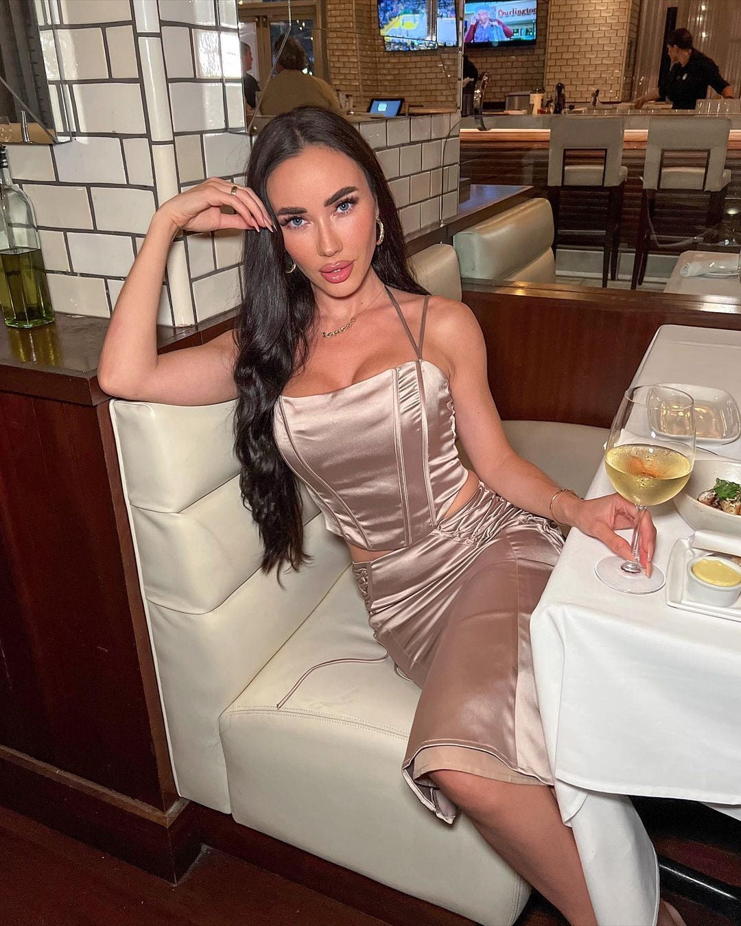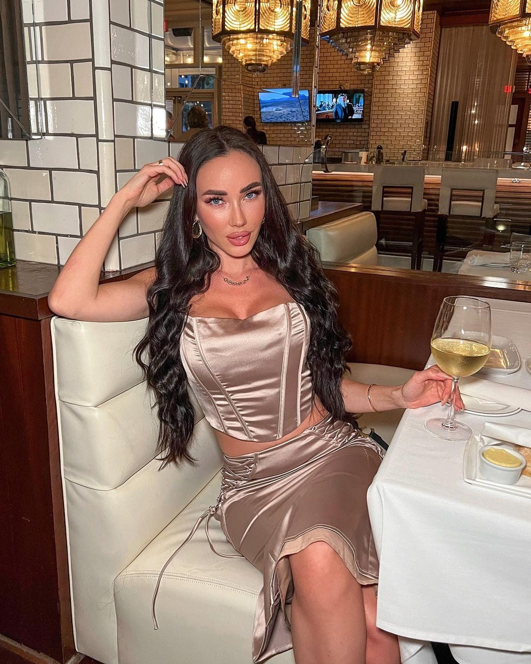 Our Anarely Two Piece Set comes in a stunning satin fabric! This set consists of a fitted halter crop top and a matching skirt Style with heels for a sexy look!