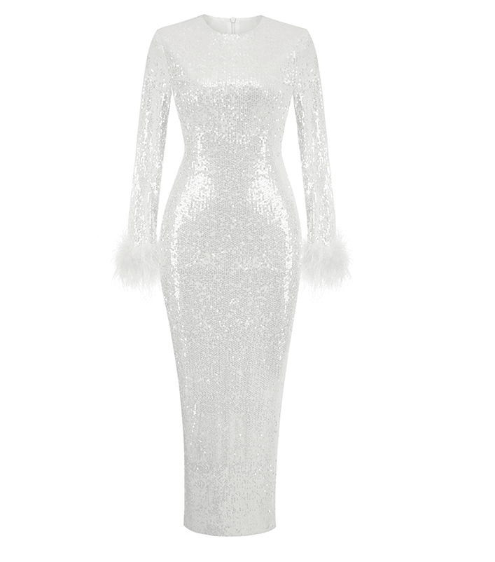 Elevate your style with the Ania Midi Dress. This luxurious white sequin dress features delicate feather detailing on the sleeves, creating a sophisticated and exclusive look. Indulge in the world of high fashion with this elegant and tasteful piece.