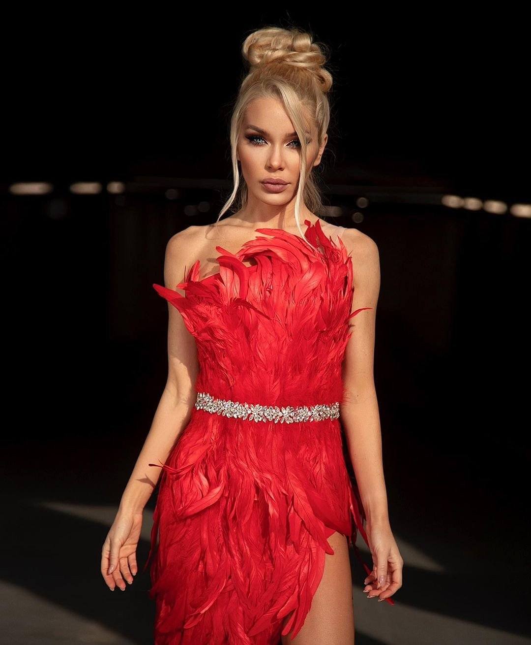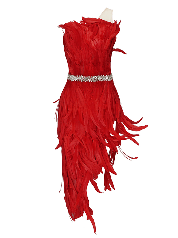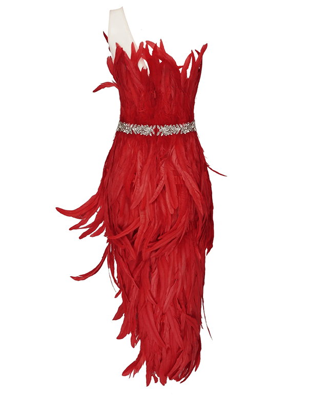 This red feather dress is perfect for those extra special occasions! Featuring a fitted silhouette, straight neckline, embellished waist detail and a thigh high side split. Style with statement earrings and heels for an ultra glam look!