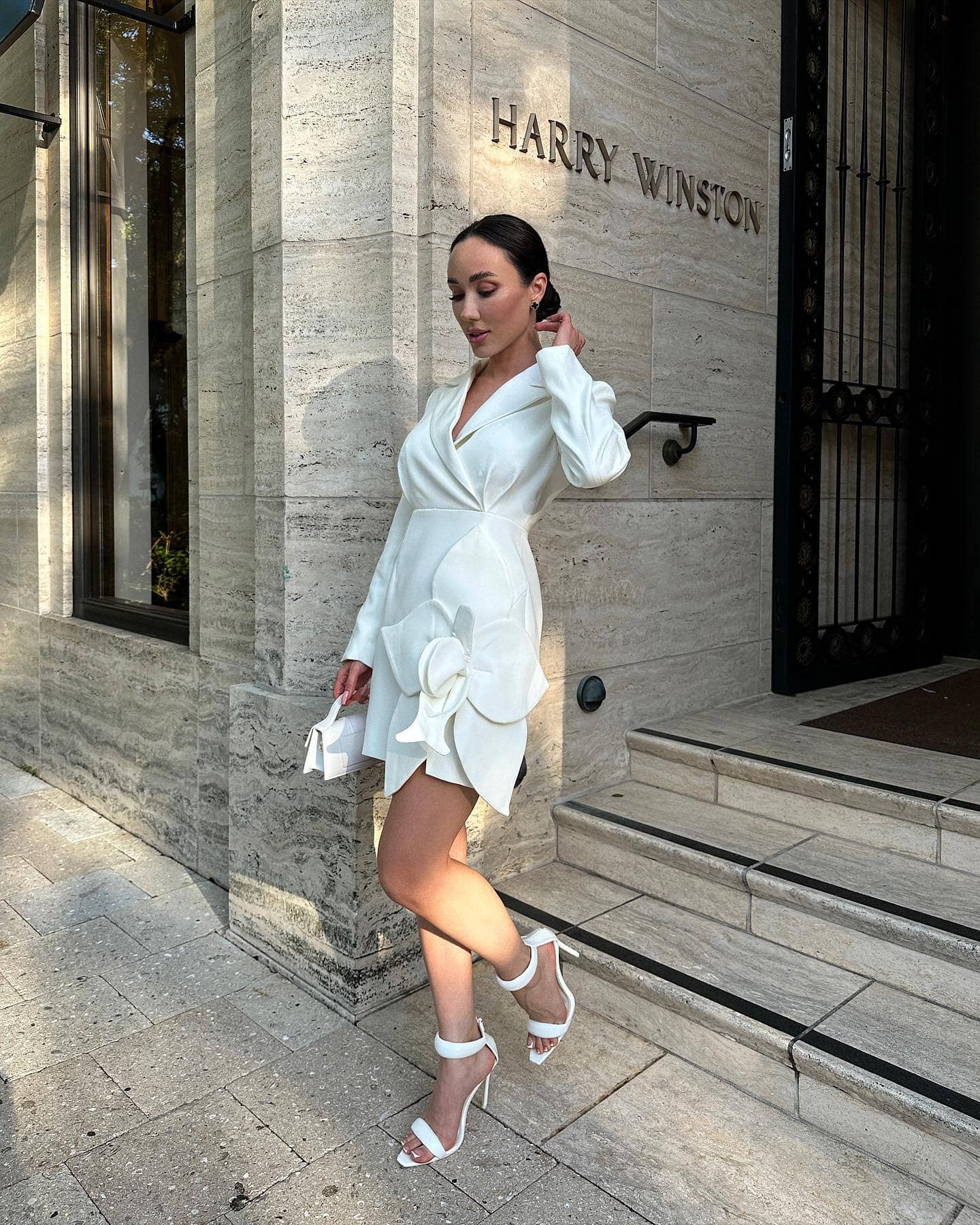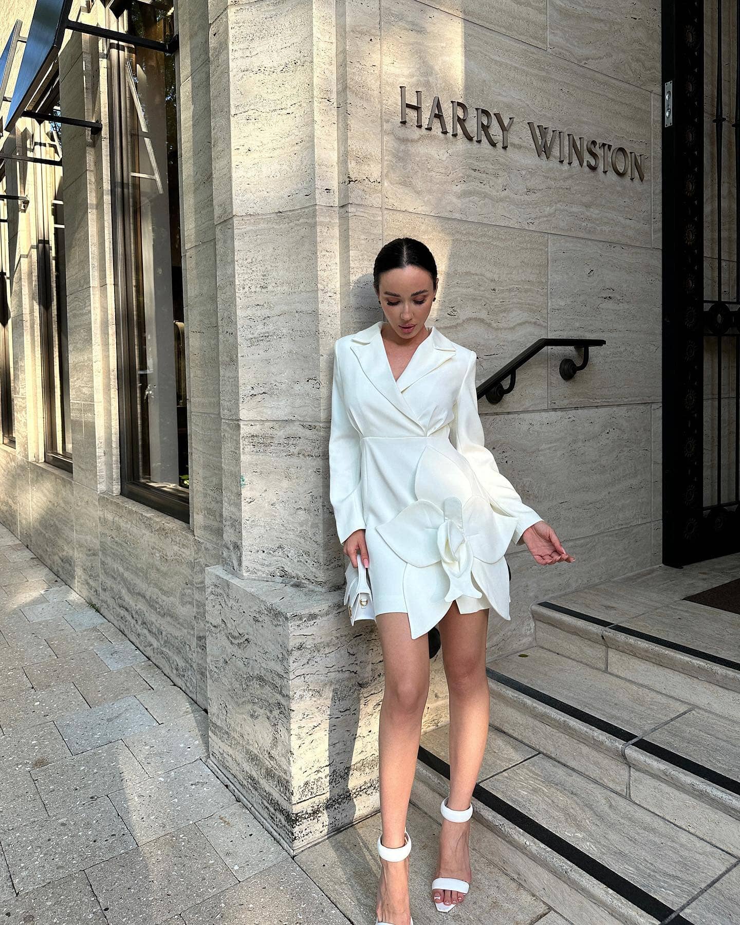 Elevate your wardrobe with the Aria Mini Dress! Made from crisp white fabric, it features a double breasted neckline and oversized flower for a luxurious look. Perfect for special occasions, this timeless piece will make you stand out from the crowd.