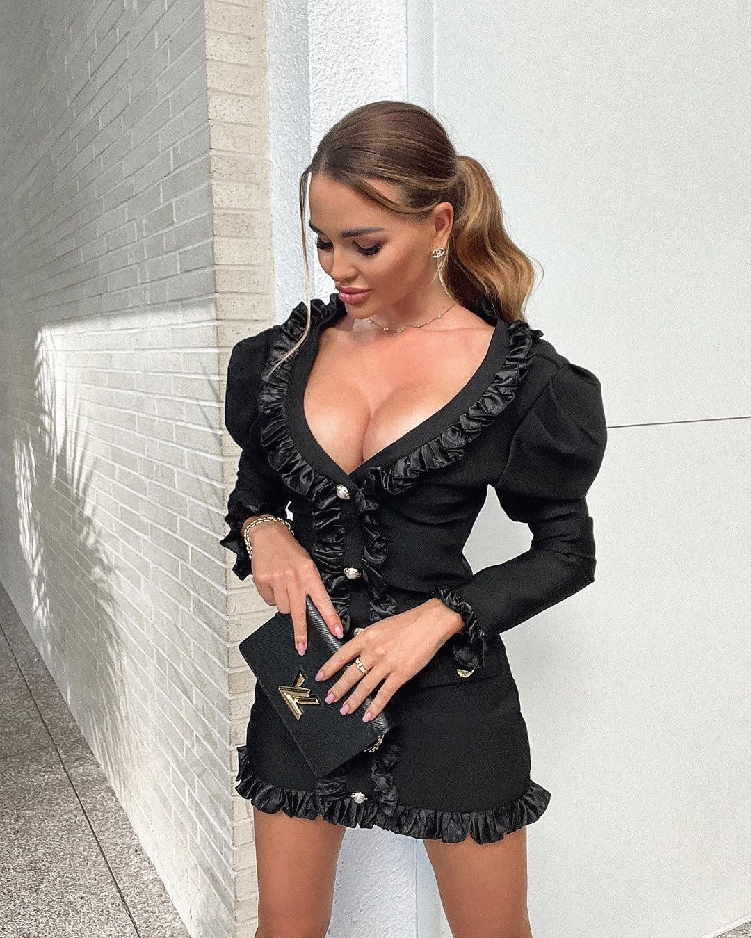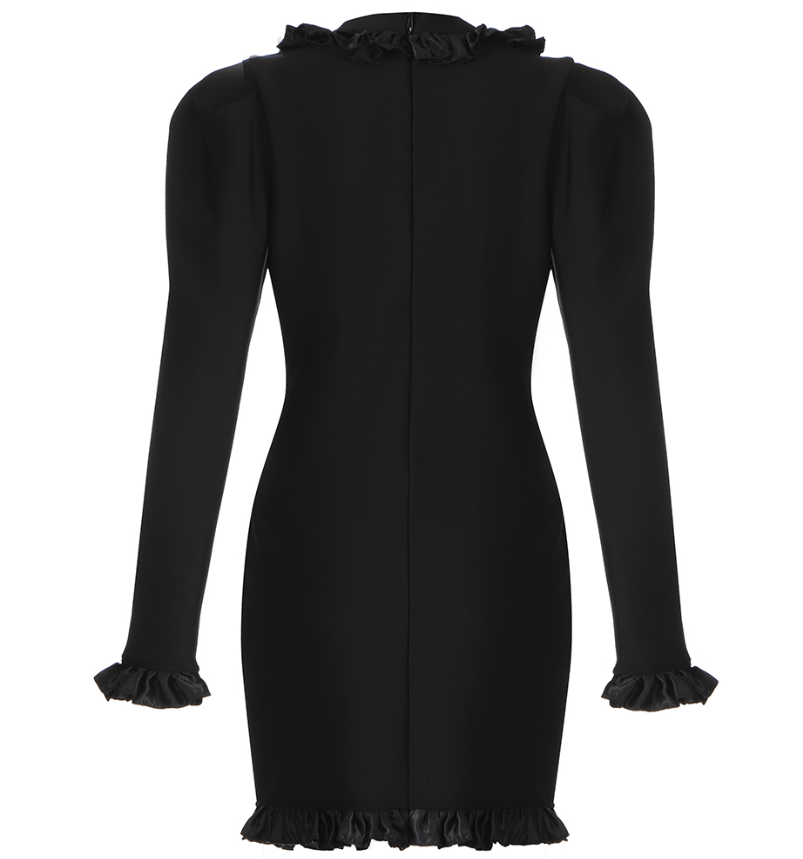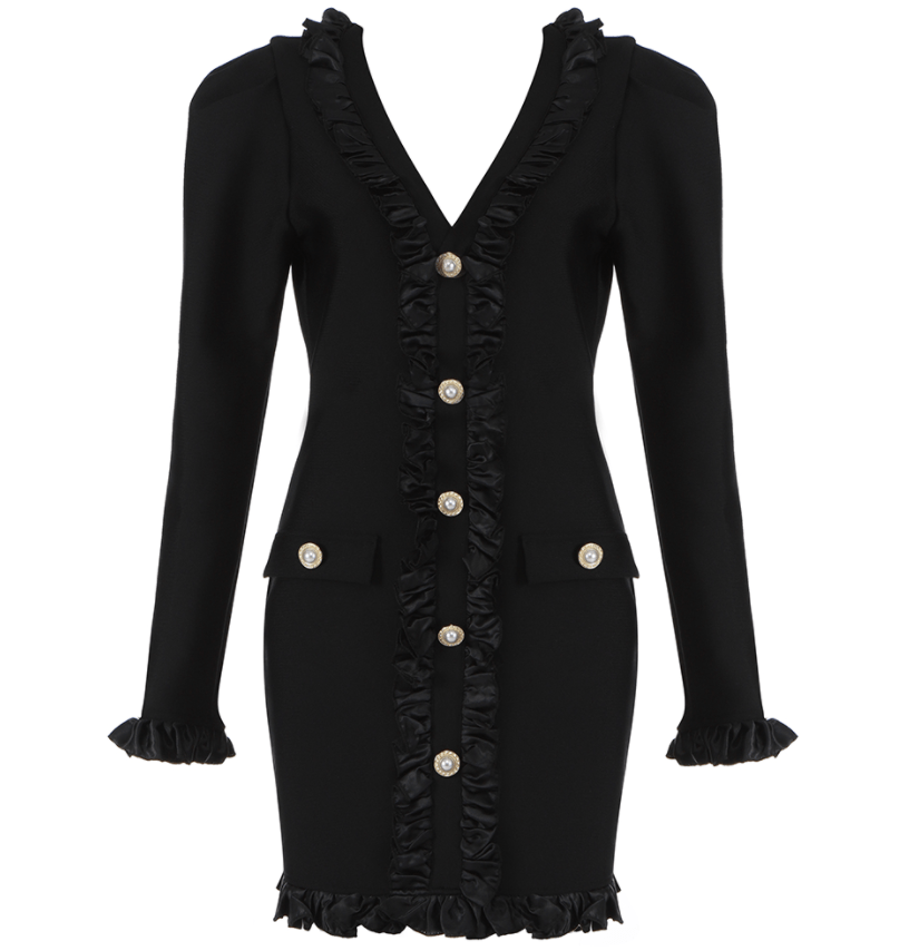 Add this chic and sophisticated dress to your wardrobe! Our Asari black mini dress features structured padded shoulders and gold buttons for extra detail. Style with strappy heels for a chic look!