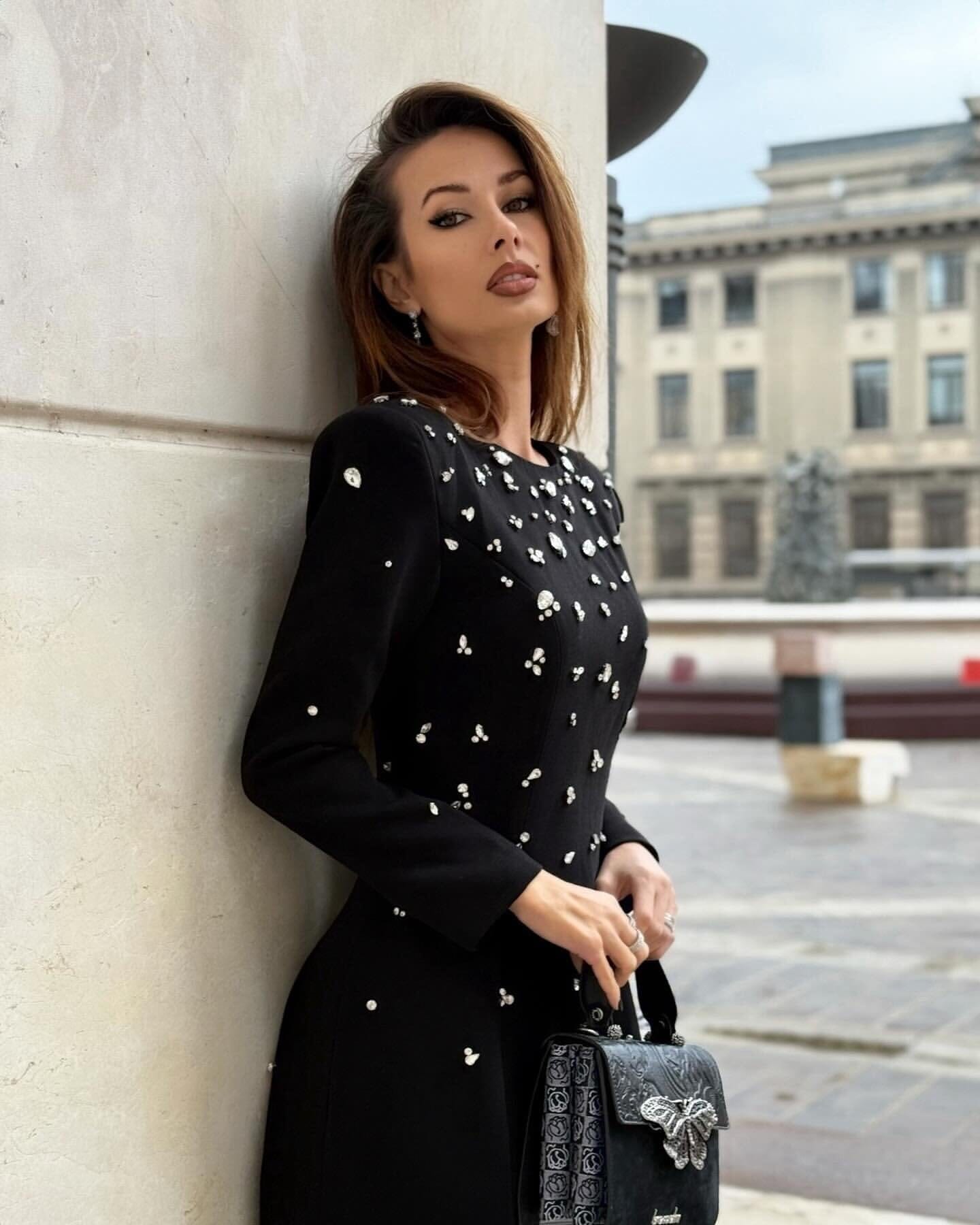 Elevate your wardrobe with the Ashra Maxi Dress. This black, long-sleeved dress features exquisite rhinestone detailing, adding a touch of sophistication to your look. Perfect for formal occasions or a night out, this dress is sure to make a statement and turn heads. Experience luxury and elegance with the Ashra Maxi Dress.