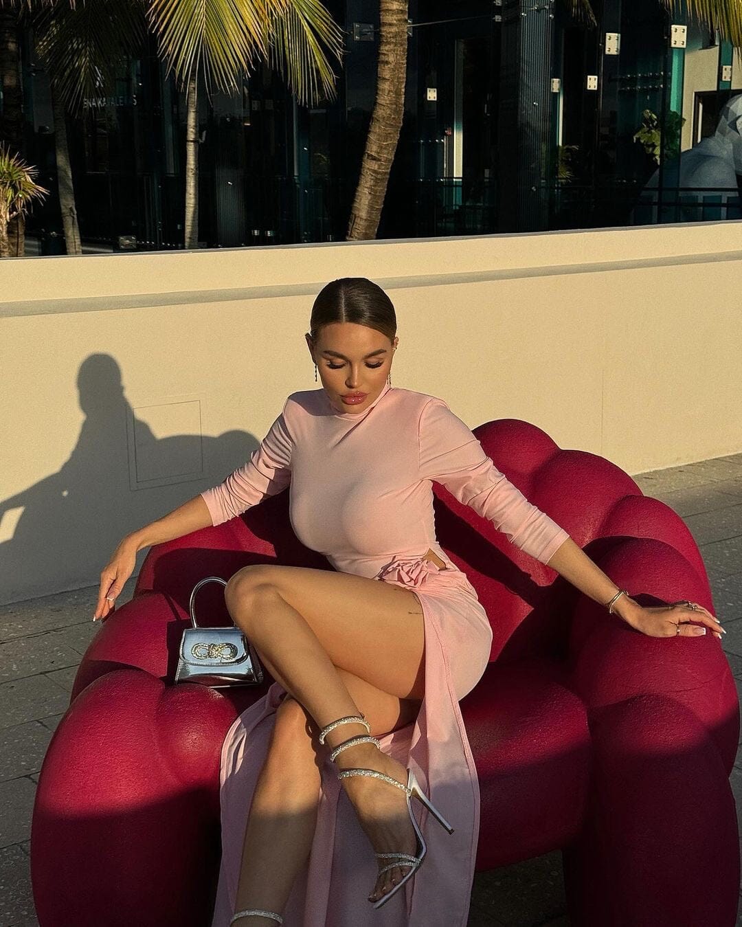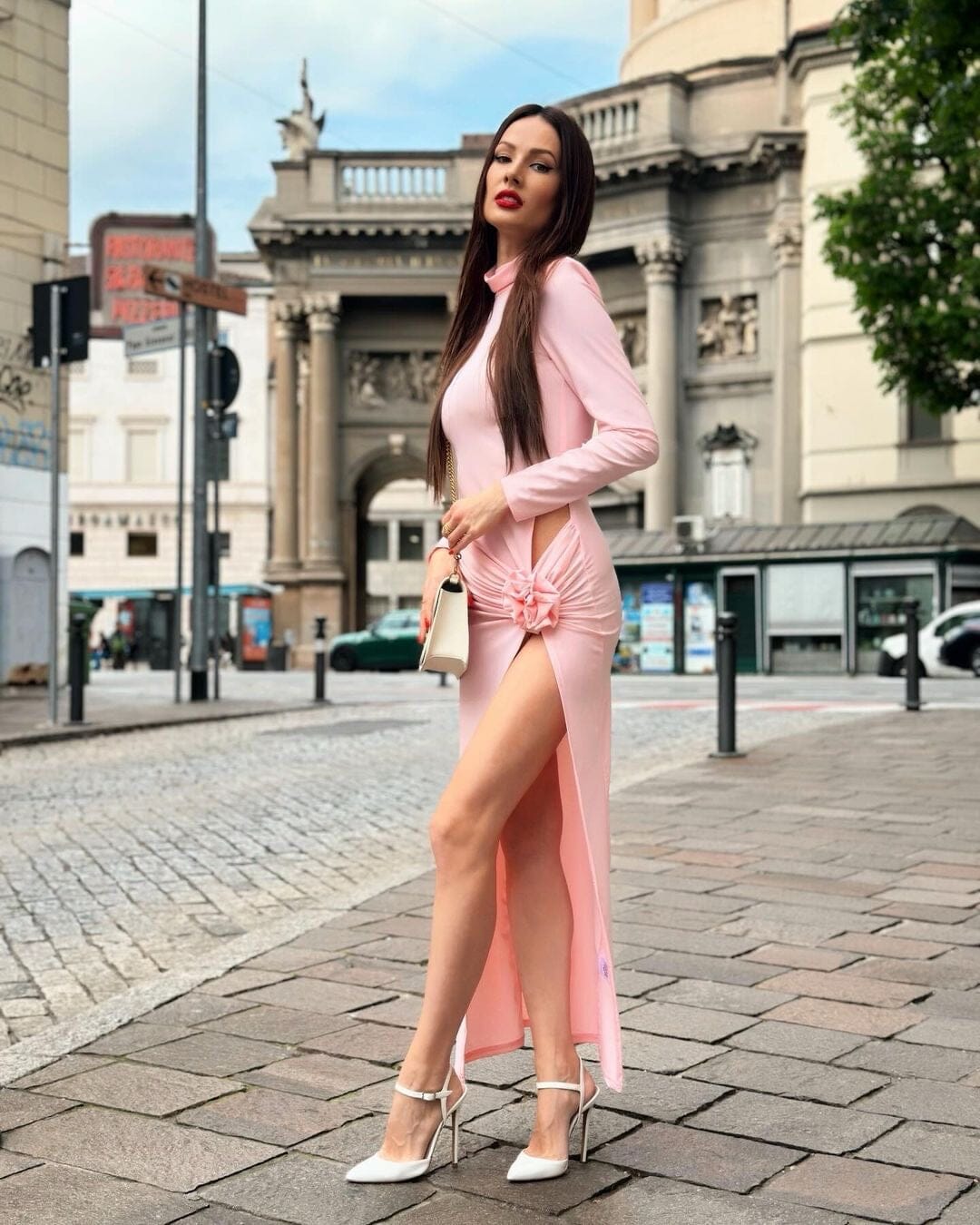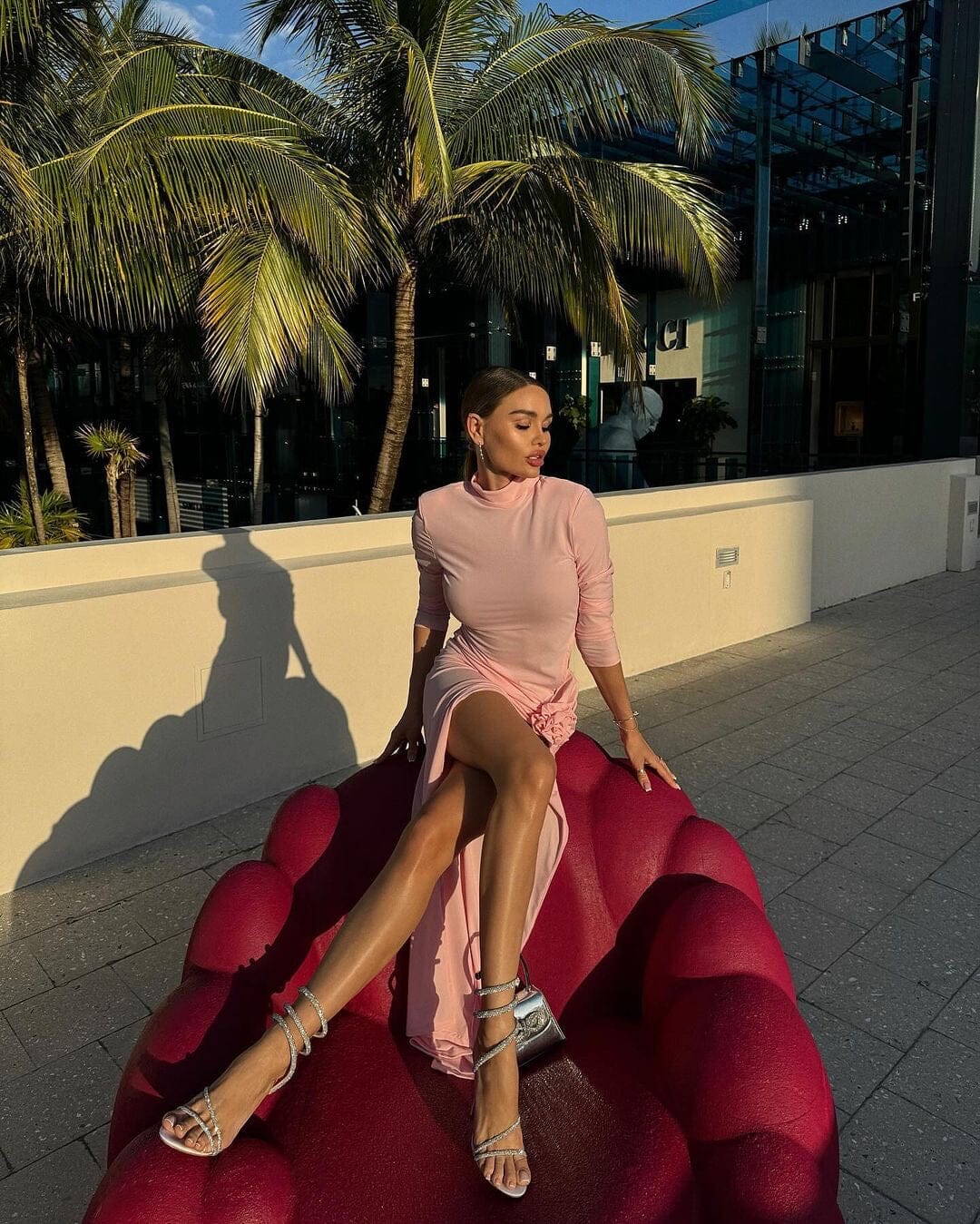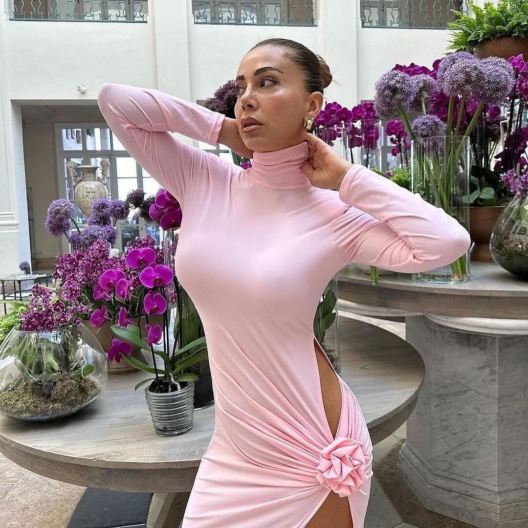 Introducing the Astrid Maxi Dress, a vision of elegance and sophistication. This stunning pink dress features a high neckline and alluring thigh slit adorned with delicate rose detail. Be the epitome of luxury and grace in this must-have piece.