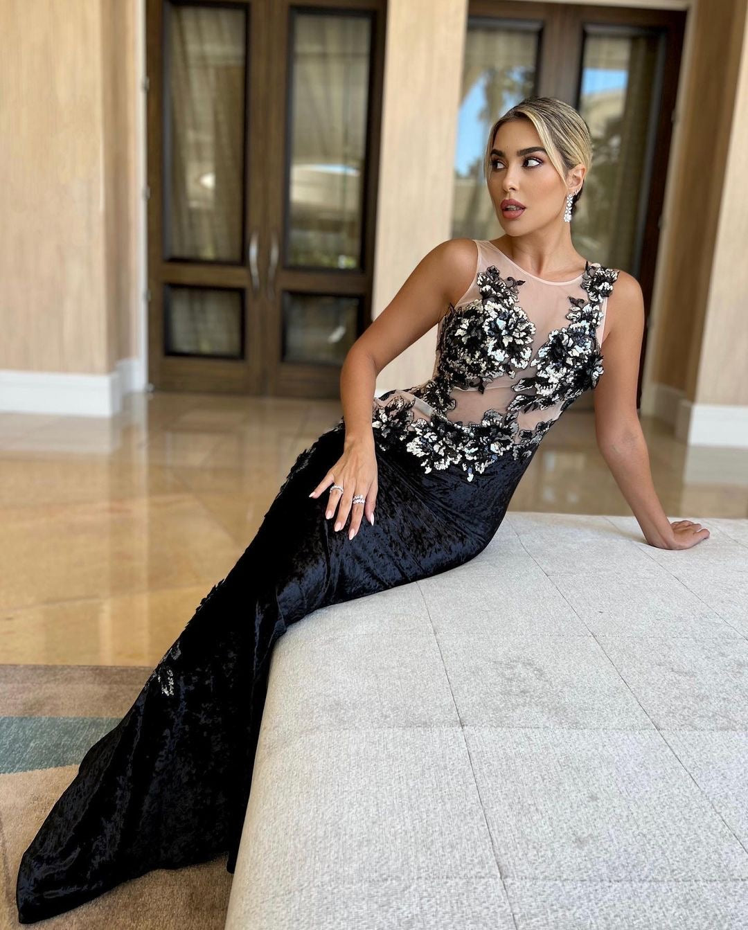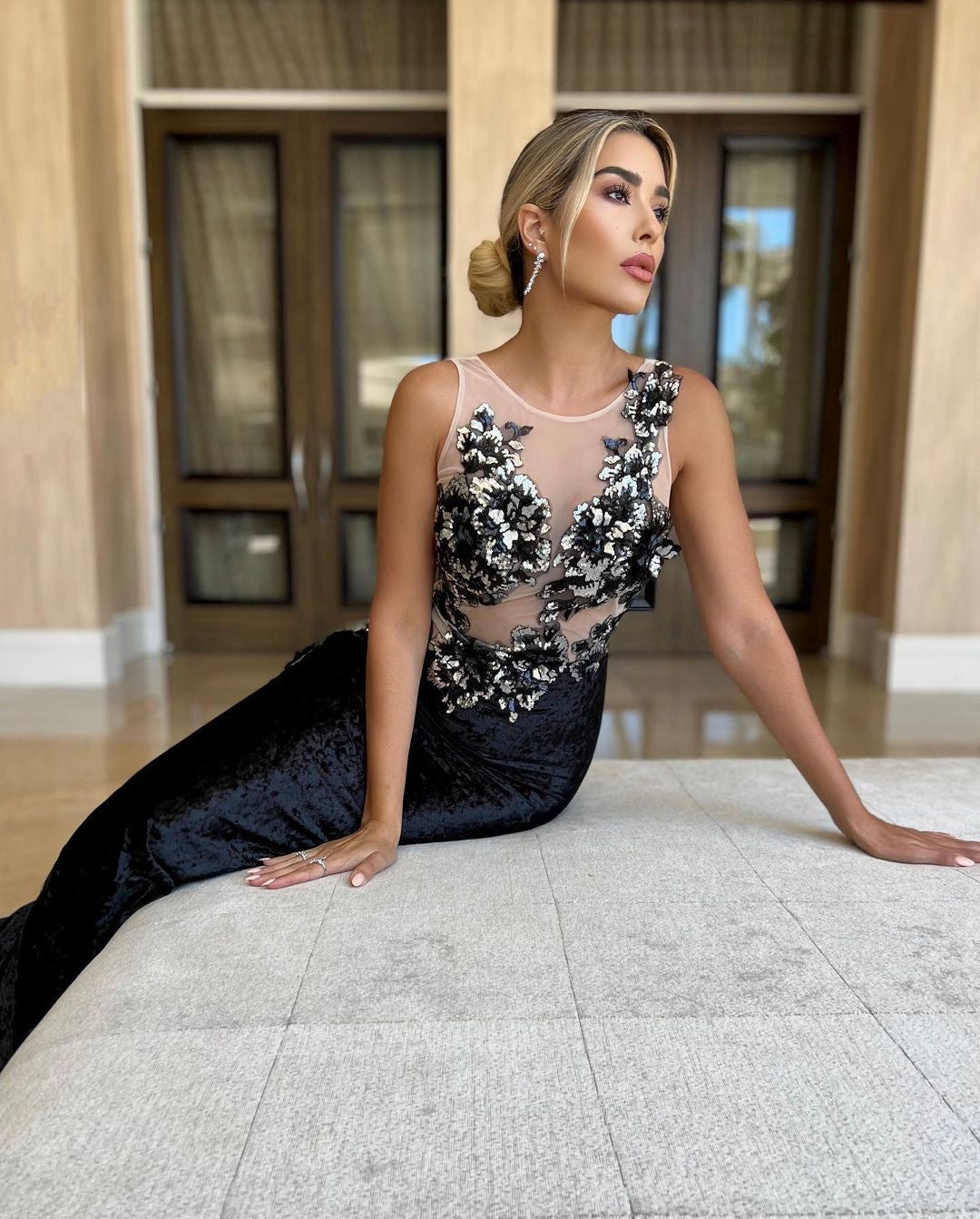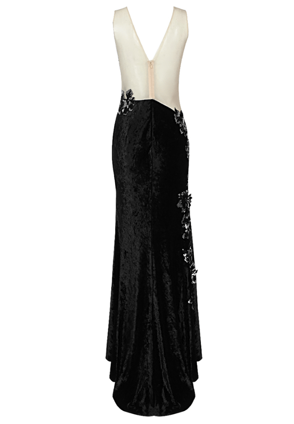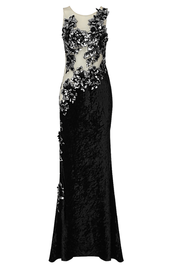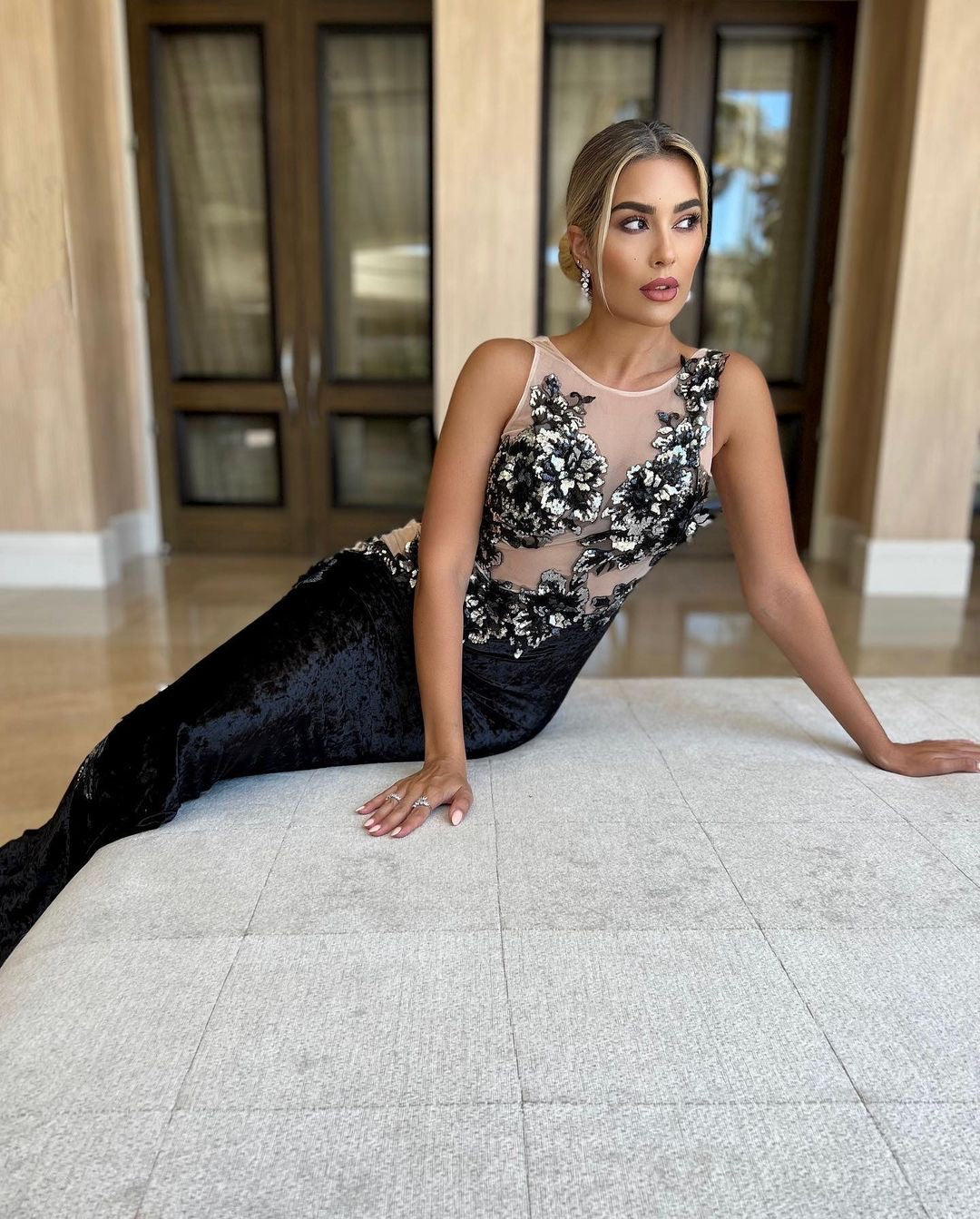 Our dramatic Bita black floor-length maxi dress is made from sequin lace. It features a round neckline and with a mesh back for extra coverage. The lace is covered in sequins from from top-to-toe.
