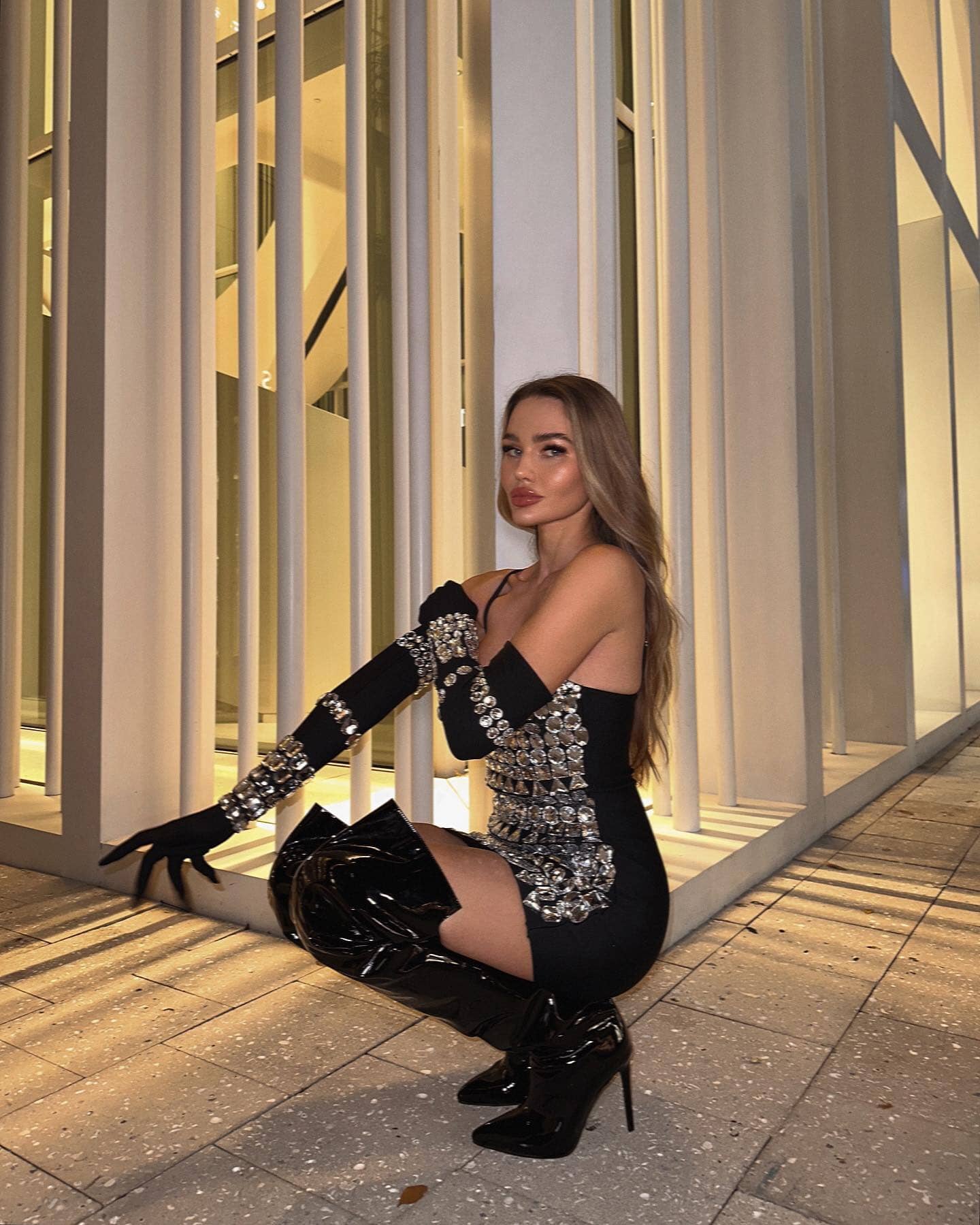 Dream of opulence in the Bonnie Mini Dress. A sweetheart neckline and oversized rhinestones provide an air of sophistication, while included gloves complete the glamorous ensemble, offering effortless allure. Step into the spotlight with timeless elegance.