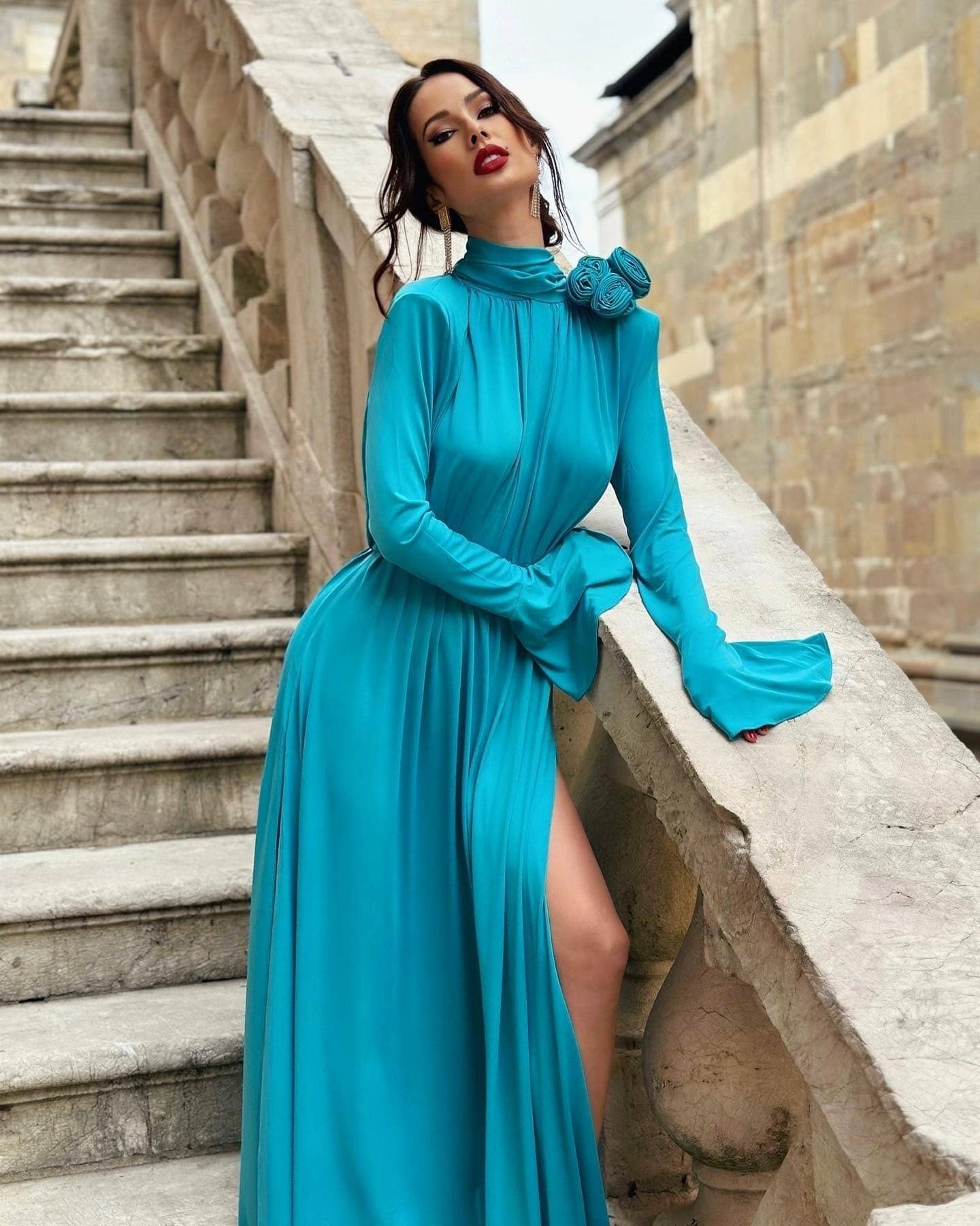 Grace the night in this elegant blue maxi dress with its charming flower detail on the neckline. Sleek long sleeves and a sophisticated aesthetic make this dress perfect for formal occasions. Show your style and make a statement with this must-have piece.