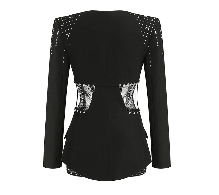 Elevate your wardrobe with the Calina Two Piece Set. This black mini playsuit and matching blazer exude sophistication and luxury, perfect for any upscale event. Adorned with dazzling rhinestone detailing, this set will make you stand out in a sea of ordinary. Elevate your style game with Calina.