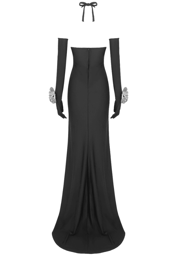 Experience elegance and luxury with our Chadia Maxi Dress. This black maxi dress features a halter neckline, elegant deep neckline, and a striking silver rose detail, making it the perfect statement piece for any occasion. Embrace sophistication and stand out in style with this exclusive and tasteful dress.