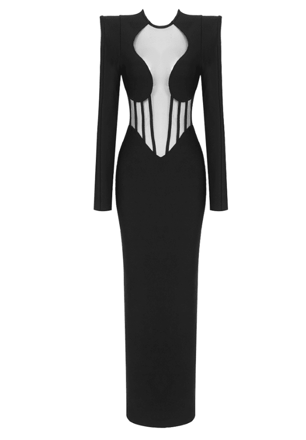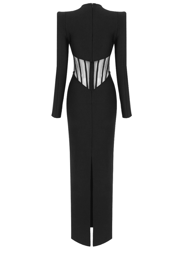 Our Chandi dress is the perfect dress to accentuate your figure! Featuring high neck and full sleeve design with a mesh corset top. Style with pumps and a mini bag for a chic look!