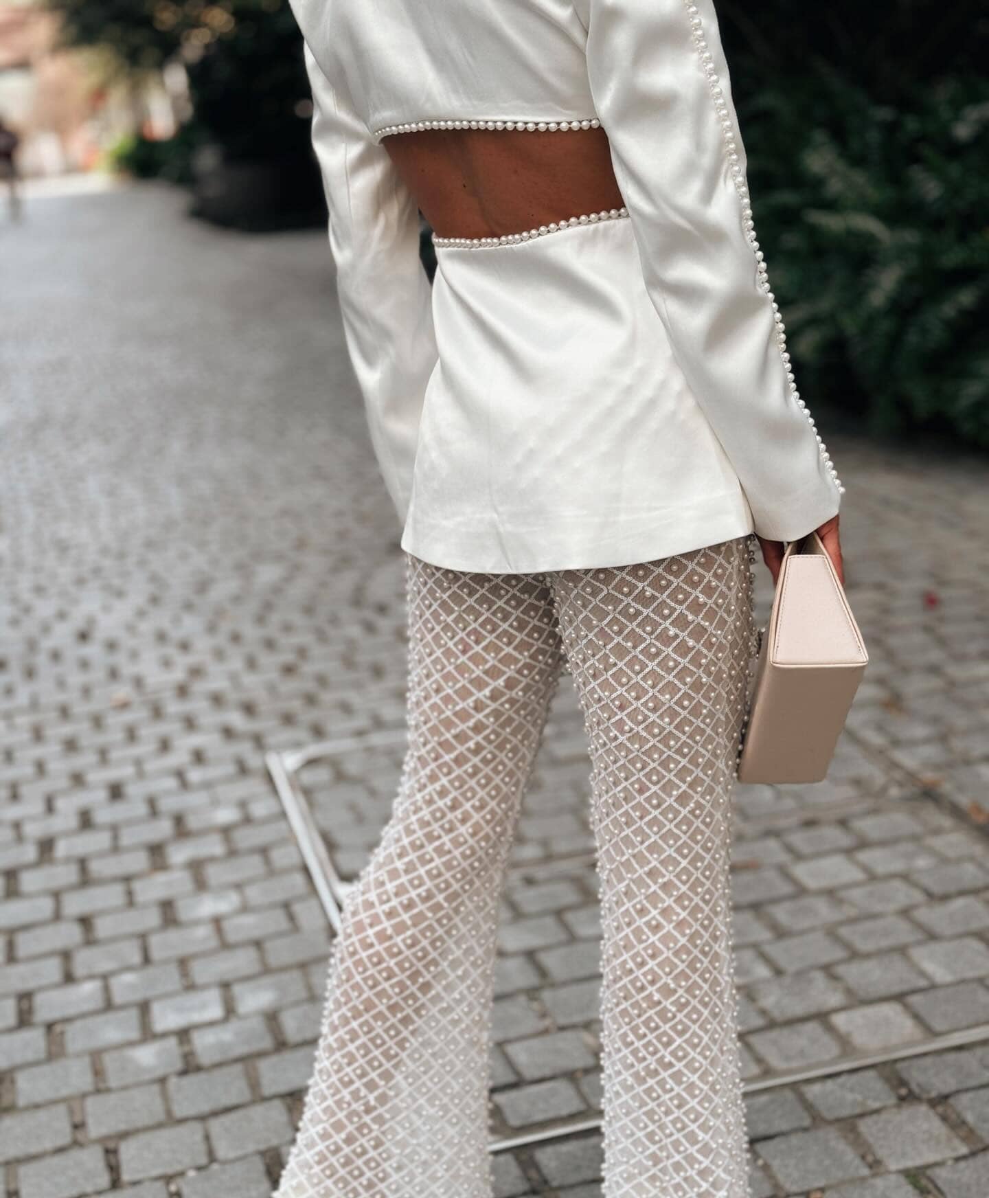 Discover sophistication and elegance with the Chau Two Piece Set. Crafted with classic white fabric, the set features pearl-detailed pants and a blazer adorned with rose and pearl accents for an exquisite look. Step into unmistakable luxury and make a statement.