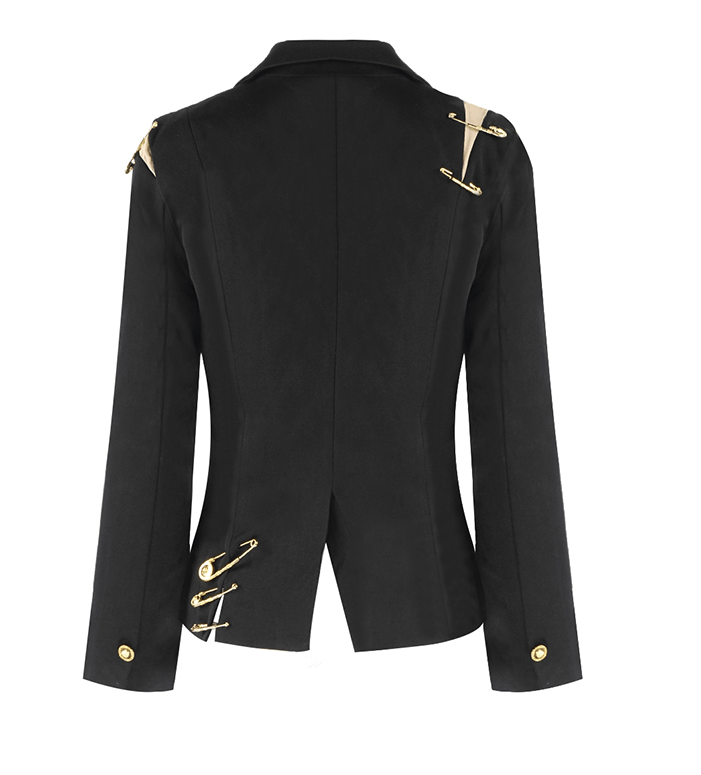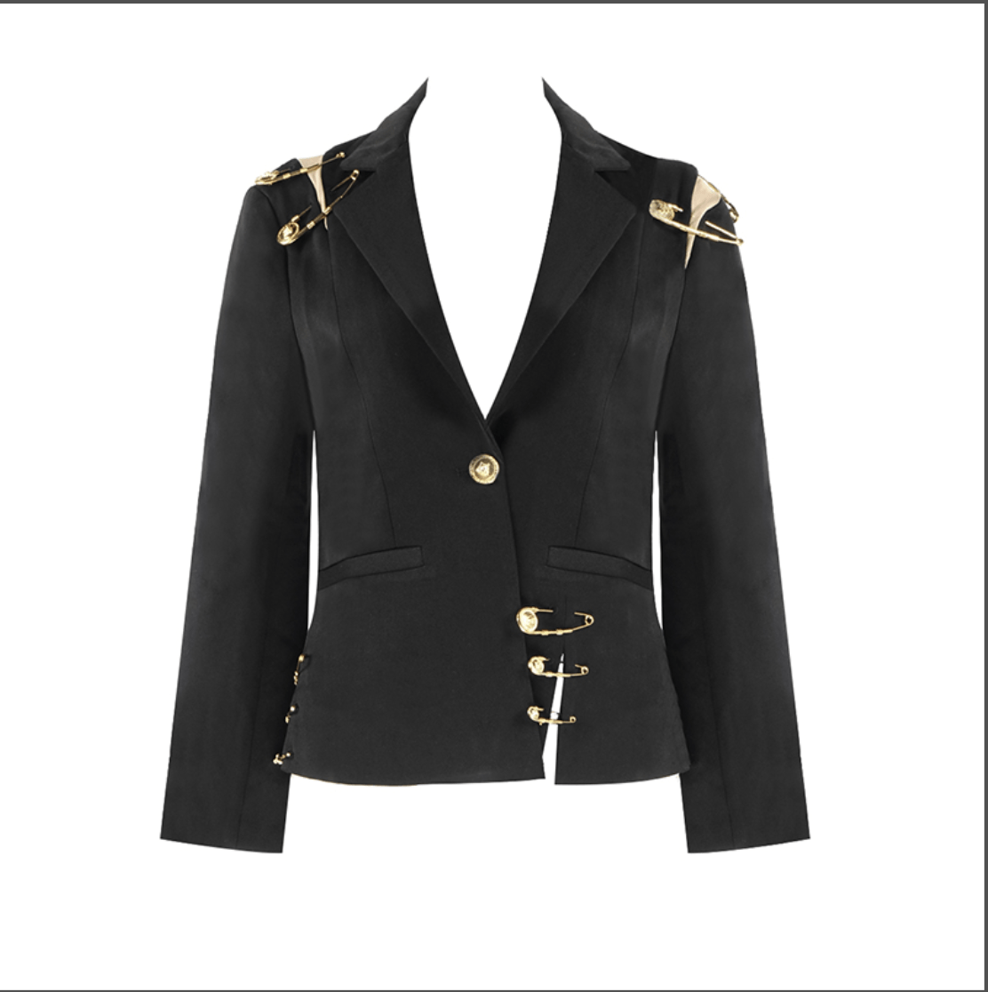 Be the center of attention in our Clare jacket. Featuring a structured blazer and oversized gold pins and buttons. Style with tailored trousers and heels to complete the look.