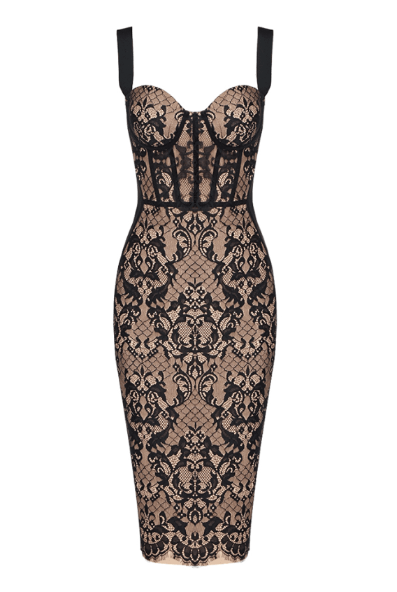 Live your best fashion dreams with the Dacia Midi Dress. Delicately crafted from black lace, it boasts a bustier-style cut designed to flatter your figure. Its elegant cut ensures you make an unforgettable entrance while its exquisite detailing adds a touch of luxe. Look divine, feel fabulous.