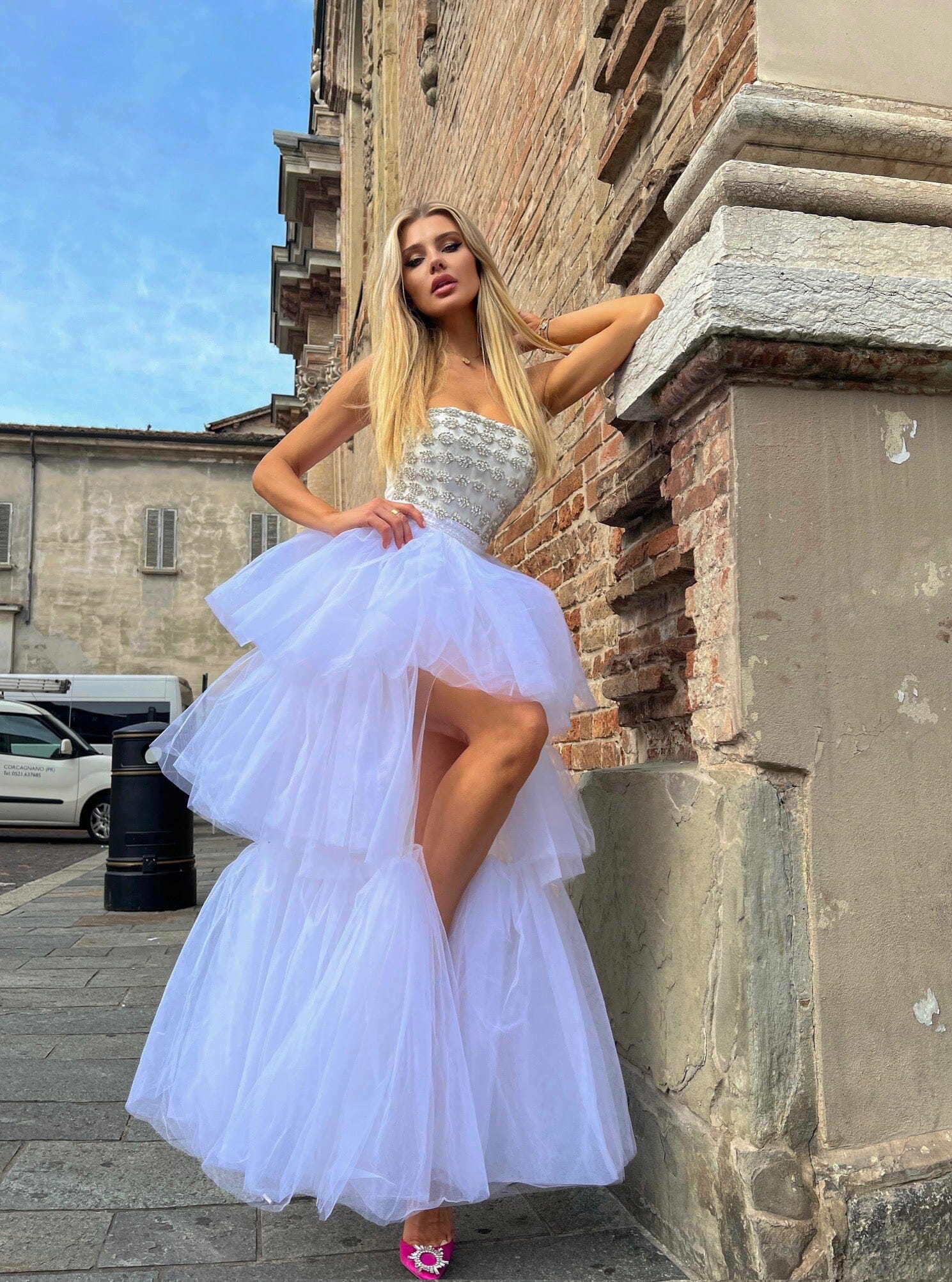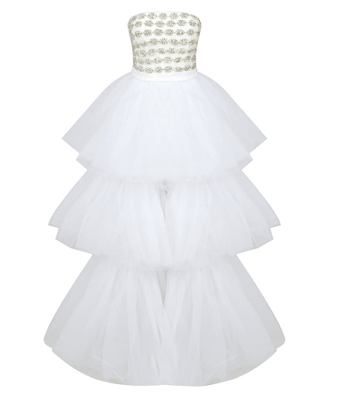 Crafted from luxuriously sumptuous white tulle, the Dami Maxi Dress radiates effortless elegance. With its intricately detailed bustier bodice and oversized cascading ruffles, this is an exquisite dress for any special occasion. Adorned with delicate sequin embellishment, this dress epitomizes timeless sophistication.