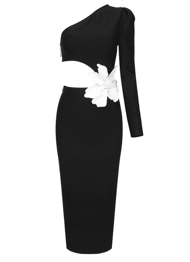 Experience elegance and sophistication with the Deslyn Midi Dress. Crafted from black fabric with a single sleeve and a waist cutout, it is a timeless piece that adds an exquisite touch of luxury to any wardrobe. The flower embellishment on the waist adds a subtle hint of femininity and grace.