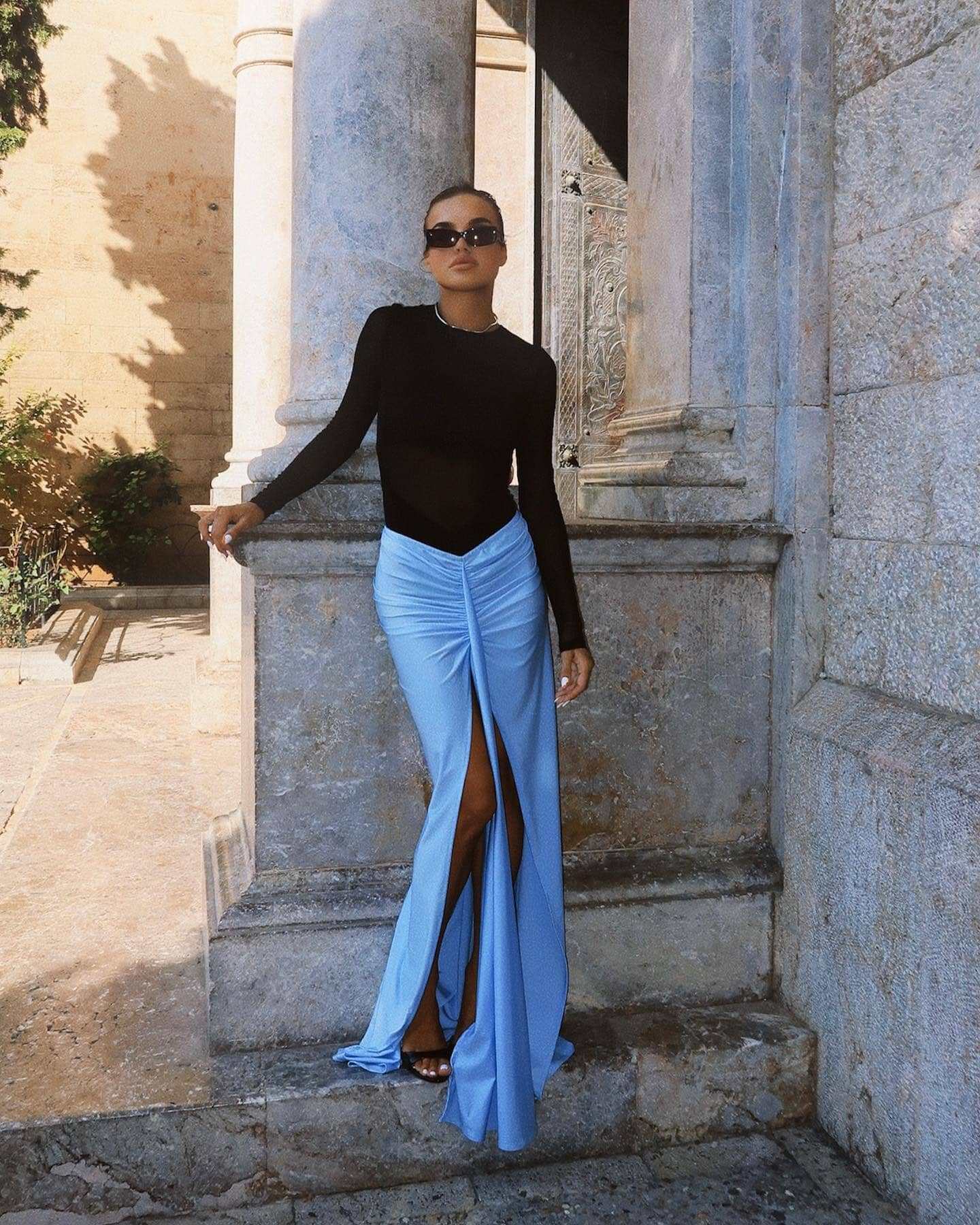 Drea Two Piece Set is the embodiment of elegance and sophistication. This timeless collection features a black bodysuit and blue maxi skirt, with a slit in the front and a cinched design to perfectly hug your silhouette. Crafted with exquisite details, this luxurious two-piece set will keep you looking chic and modern.