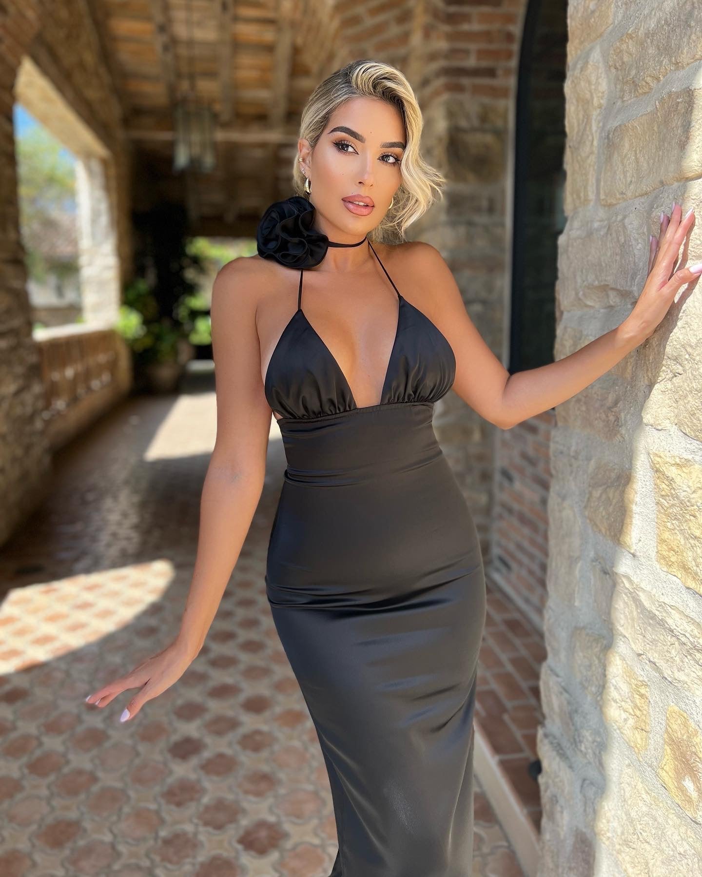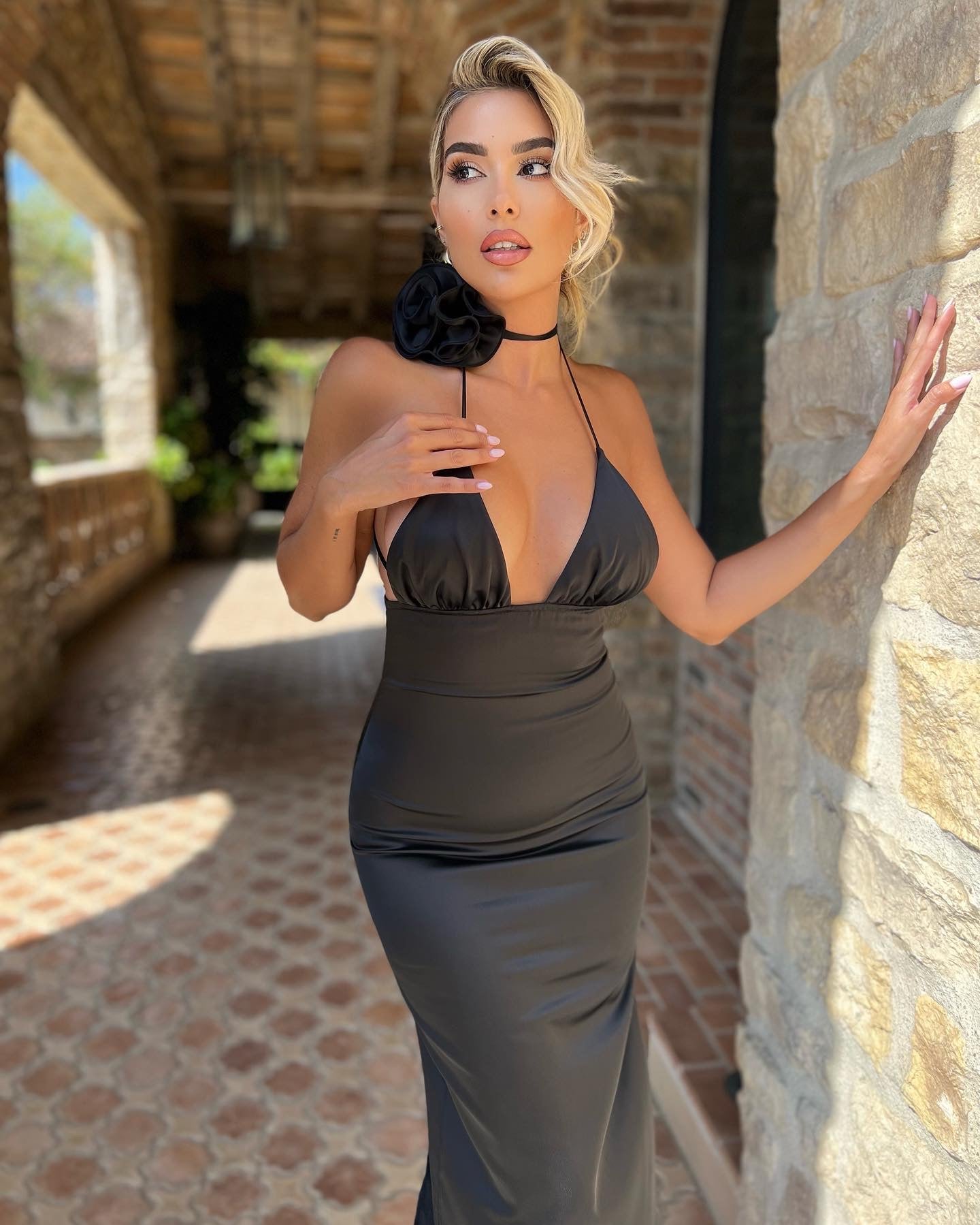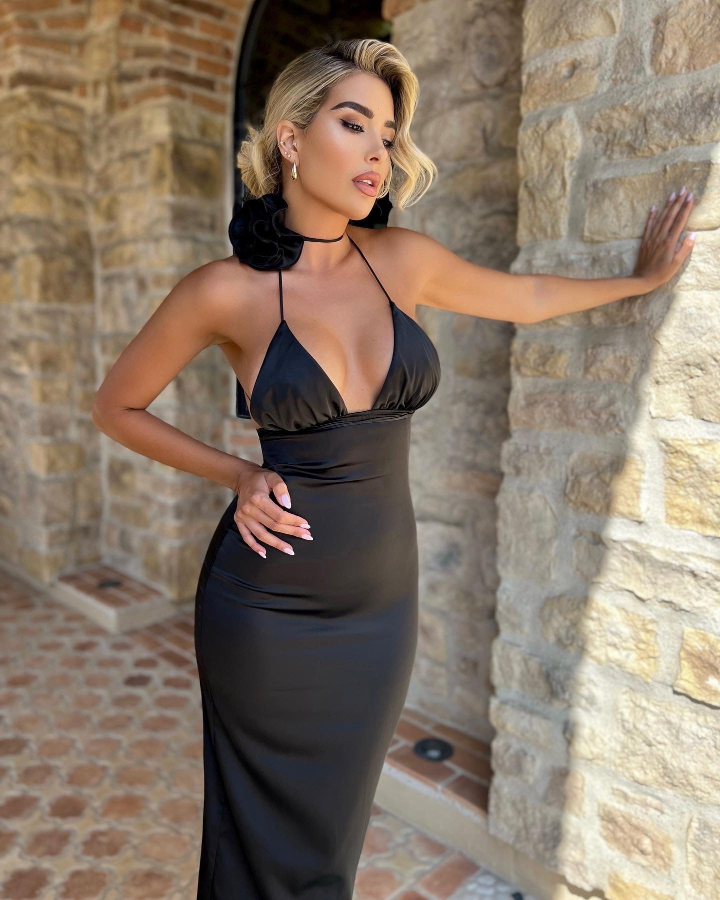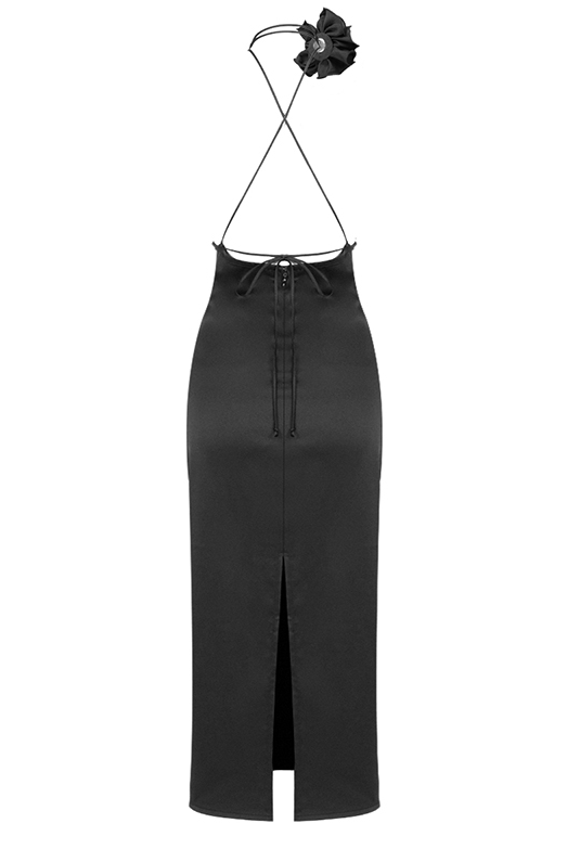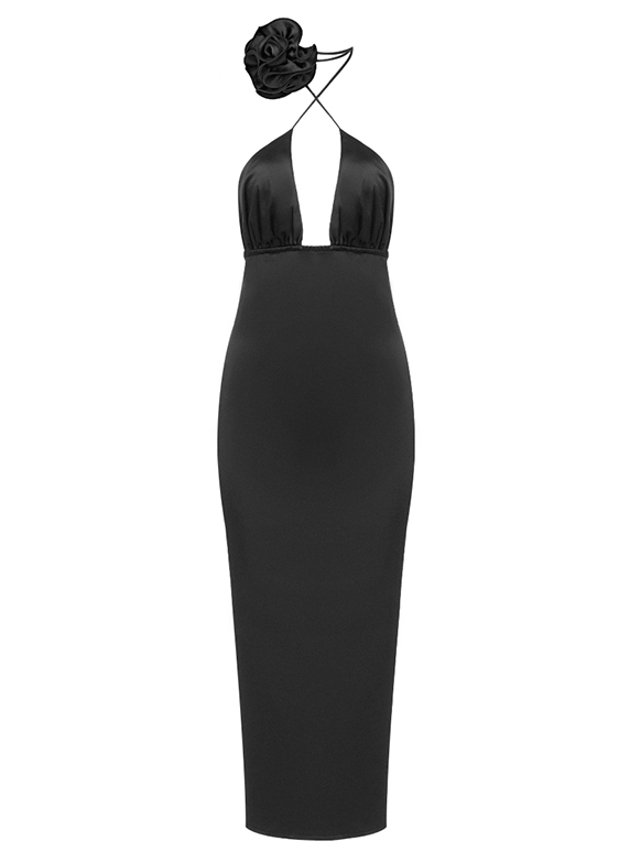 Fern is our spaghetti-strap black midi dress. This stunning midi dress has a flower detail on the chest and is cinched at the waist for a more flattering fit. This dress can be styled in various ways, making it a must-have for any occasion.