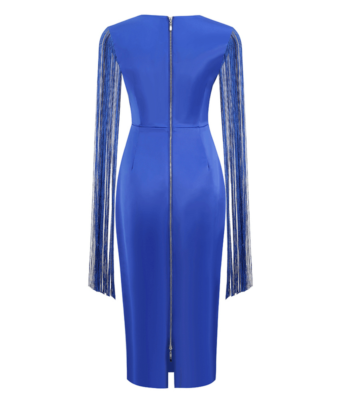 Gerdy is our newest midi dress. This stunning midi dress has satin and fringe detail on the sleevs. This dress is cinched at the waist for a more flattering fit. This dress can be styled in various ways, making it a must-have for any occasion.