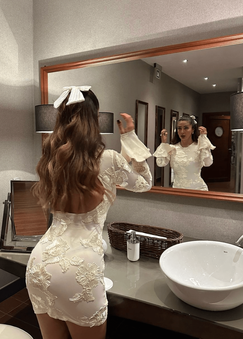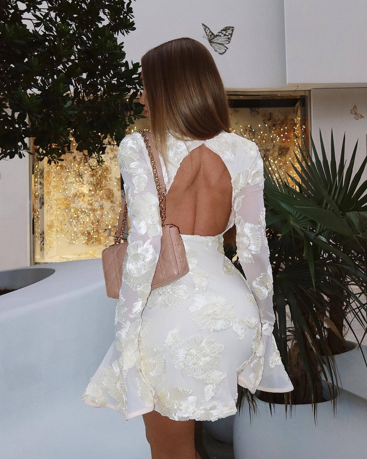 Experience the allure of the Gerta Mini Dress — a timeless classic crafted from luxurious white fabric, featuring a full sleeve silhouette with a delicate floral-printed finish. Perfect for special occasions, this exquisite dress will make you feel effortlessly elegant and stylish.