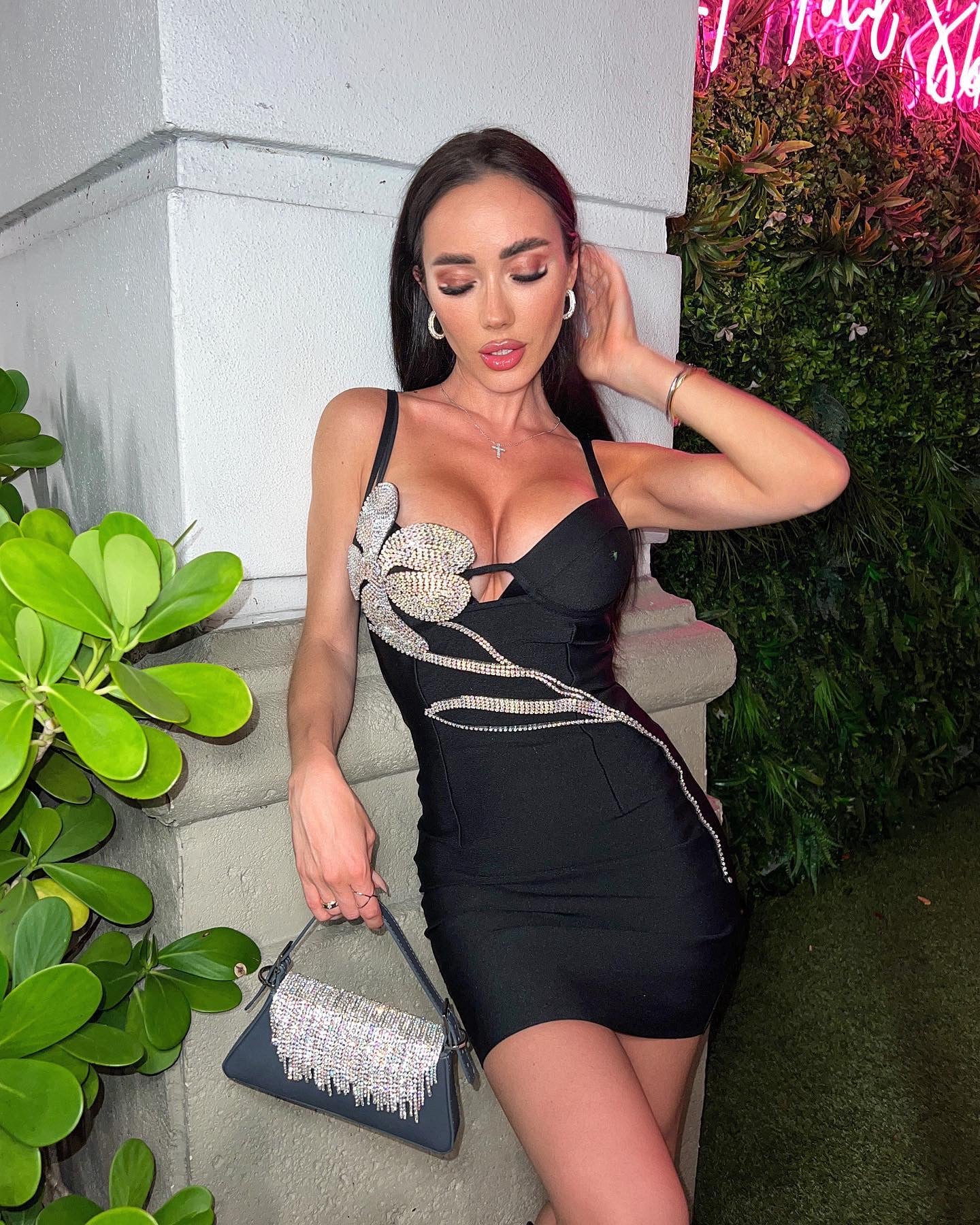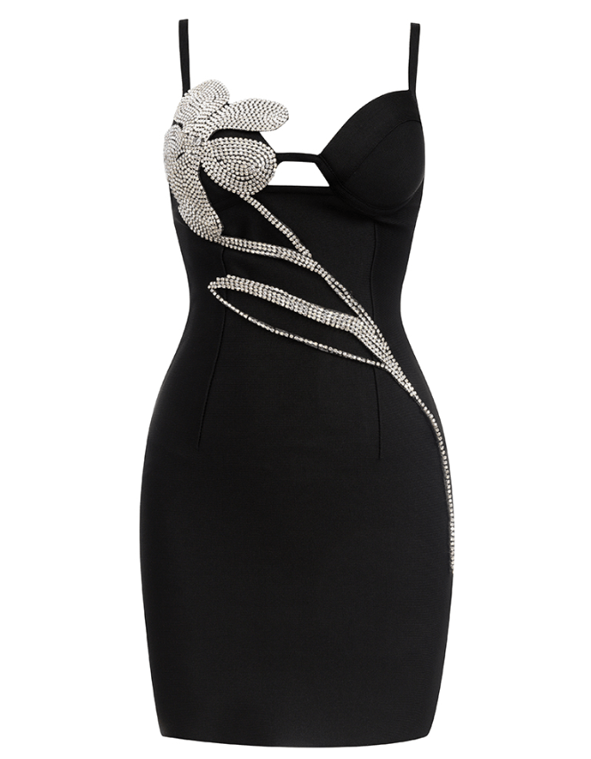 Feel party ready in our Greta Dress. Featuring a rhinestone flower design, and a figure-hugging fit. Pairs well with strappy heels for a look that will take you anywhere, from parties to nearby dancefloors and date nights.