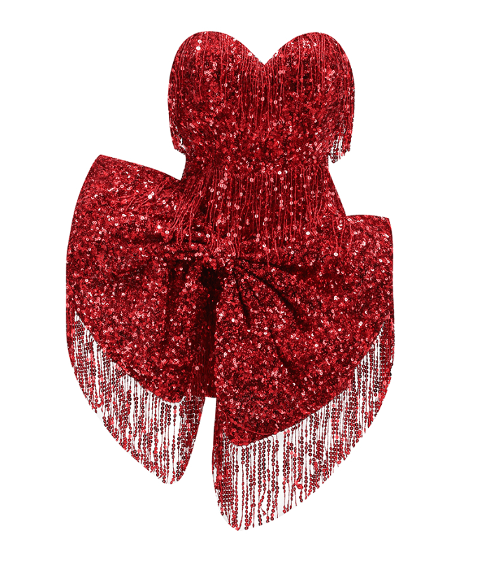 Indulge in the luxury of Haisy's Mini Dress. This red sequin dress with an oversized bow detail exudes elegance and sophistication. Be the star of the night and make a statement with this exclusive piece. Perfect for any special occasion.