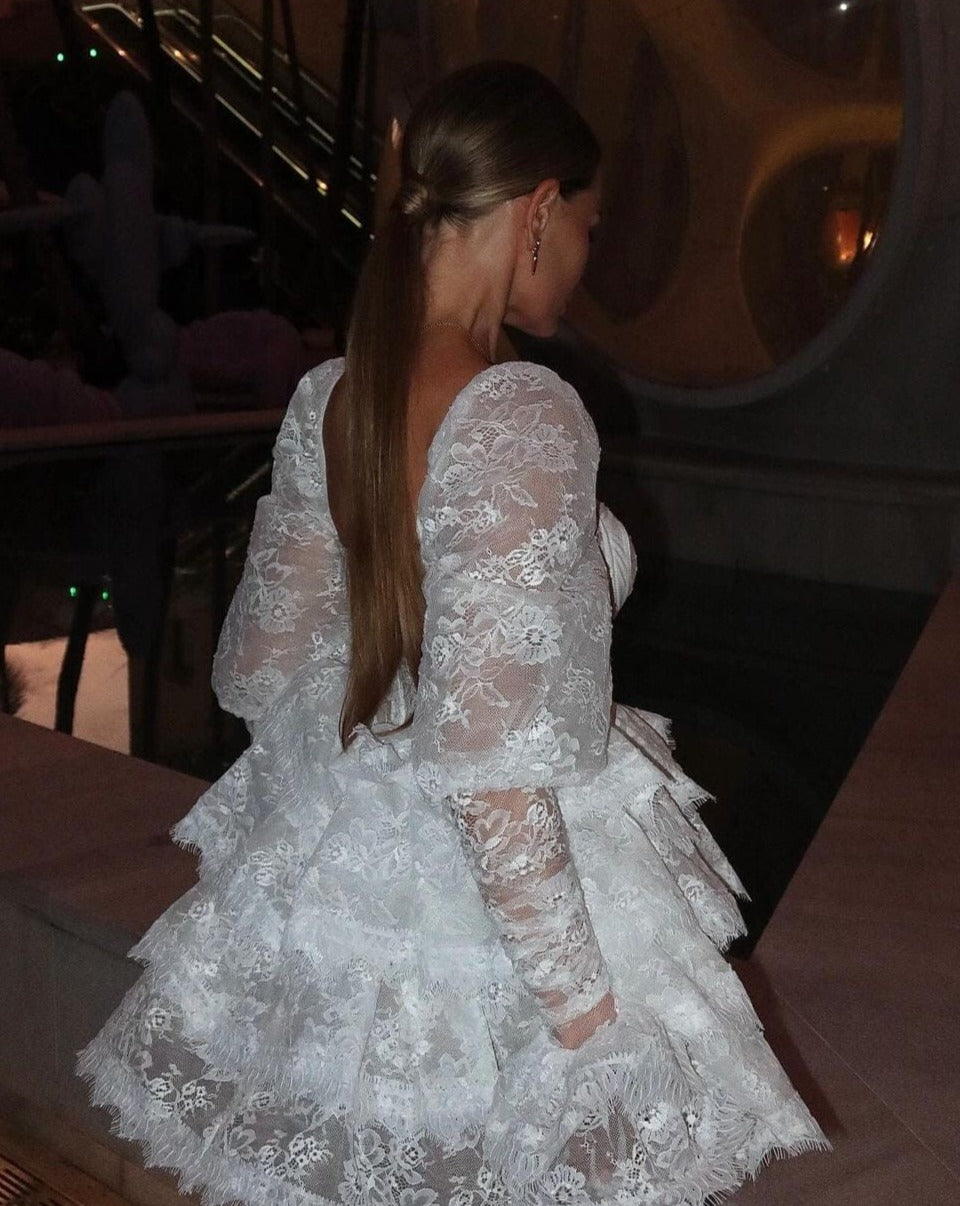 Experience luxury and elegance in our Hana Mini Dress. With intricate lace detailing and a flattering bustier top, this dress exudes sophistication. The ruffle bottom and puffed sleeves add a touch of romance to this piece. Perfect for special occasions and events.