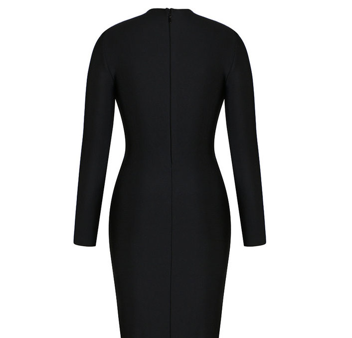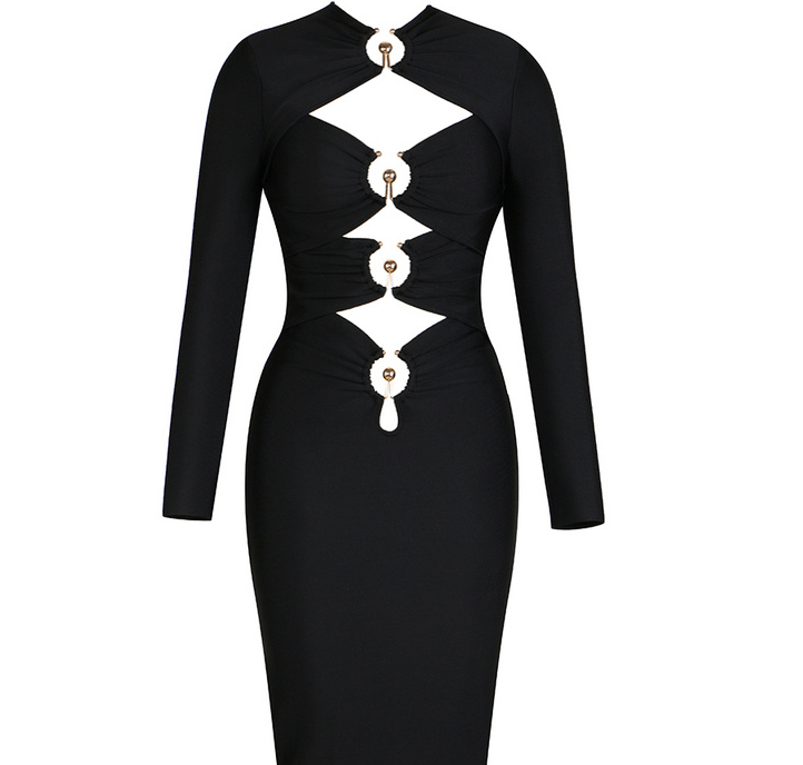 Our Haya dress is our black body hugging midi dress. It features front cutouts with buckles for extra detail. Style with heels and a mini bag for a look we're loving.