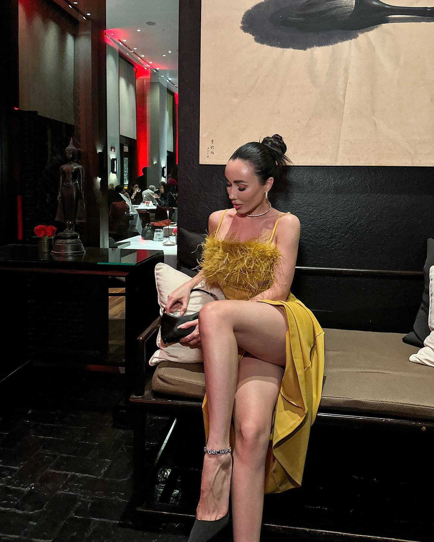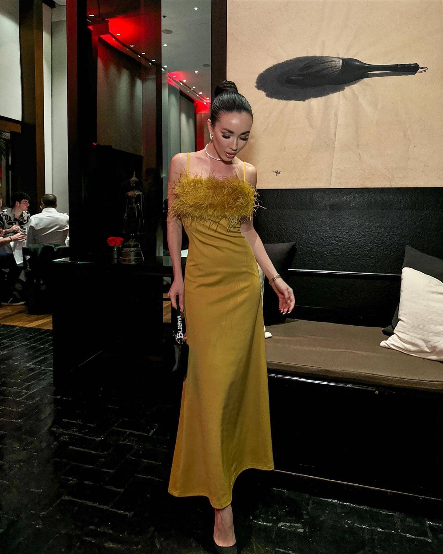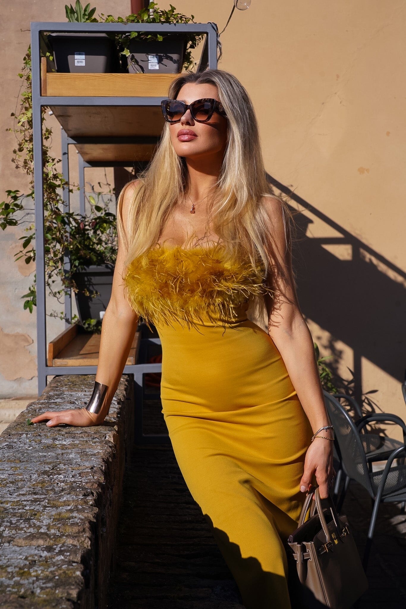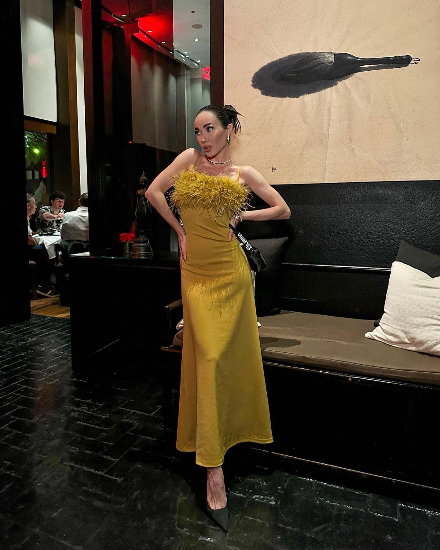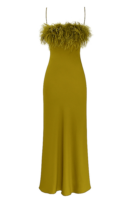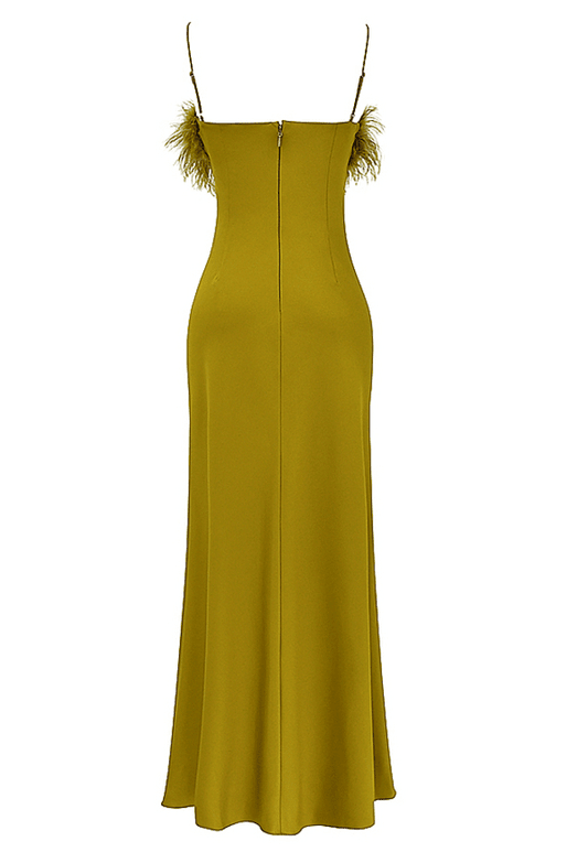 Get ready to stand out with our Imane maxi dress! Featuring spaguetti straps and feather detail in a satin material. Style with heels for a look we're obsessed with!