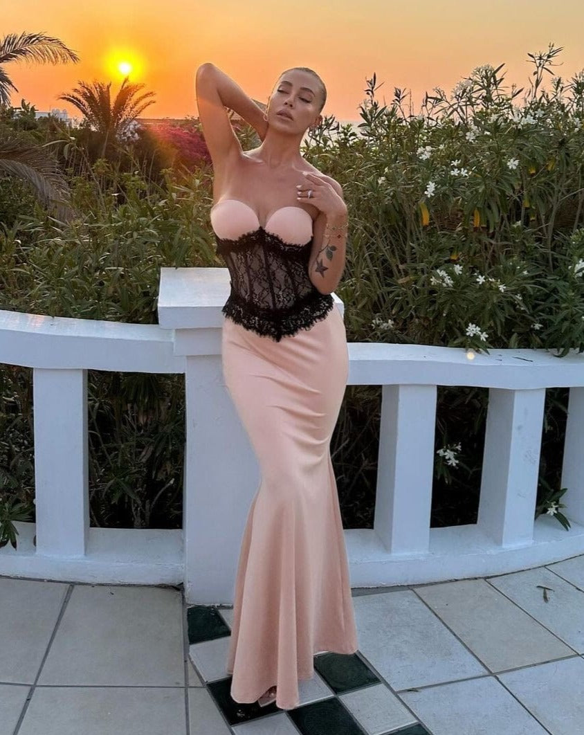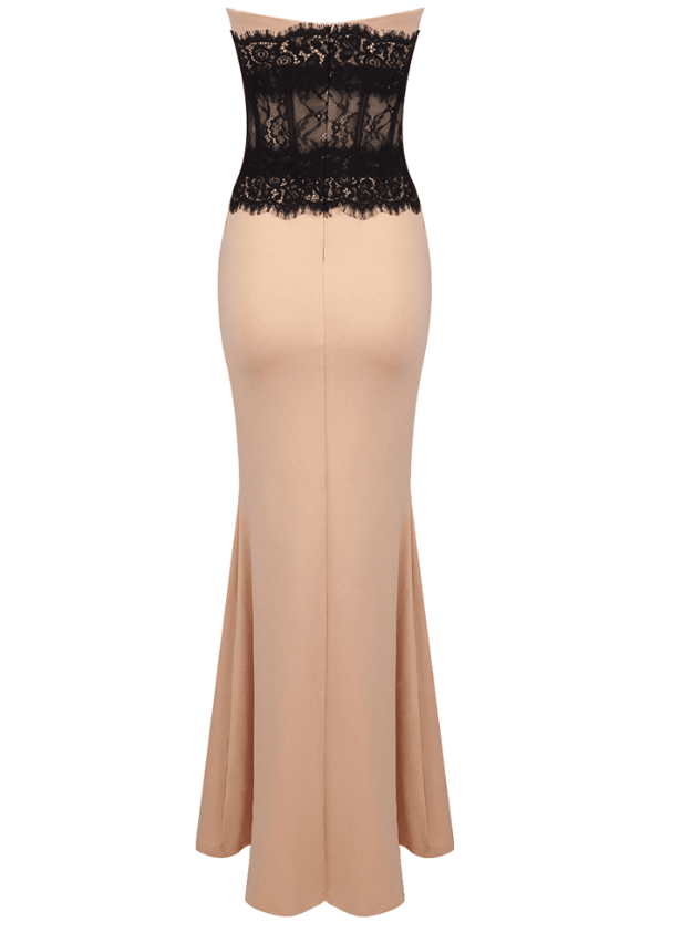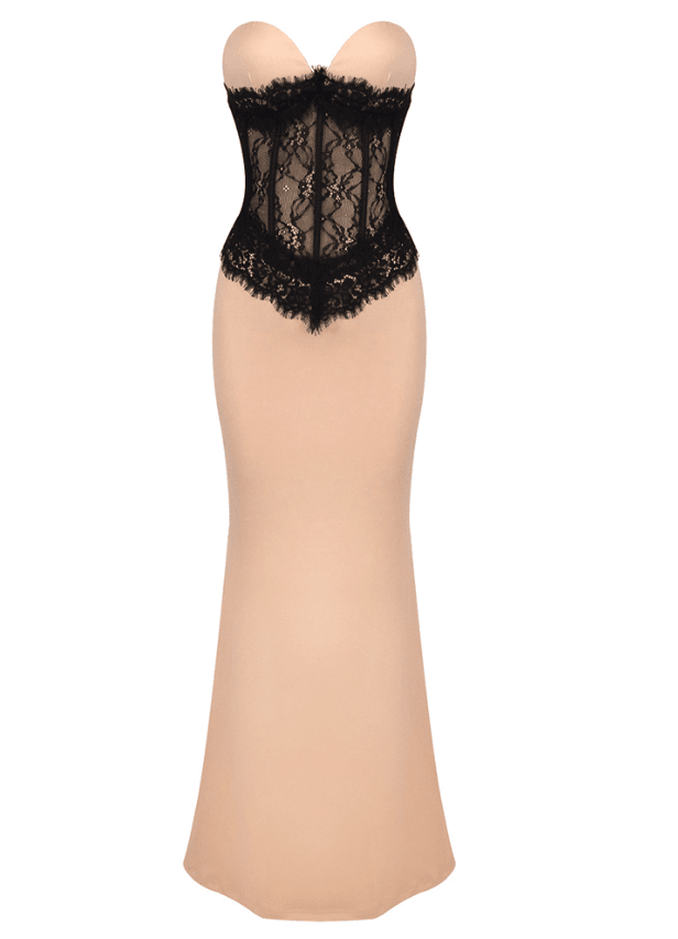 Indulge in the art of elegance with our Ina Maxi Dress. This strapless masterpiece features a nude fabric that delicately drapes your body, while the lace corset adds a touch of sensuality. Perfect for any special occasion, this dress will make you feel confident and sophisticated.