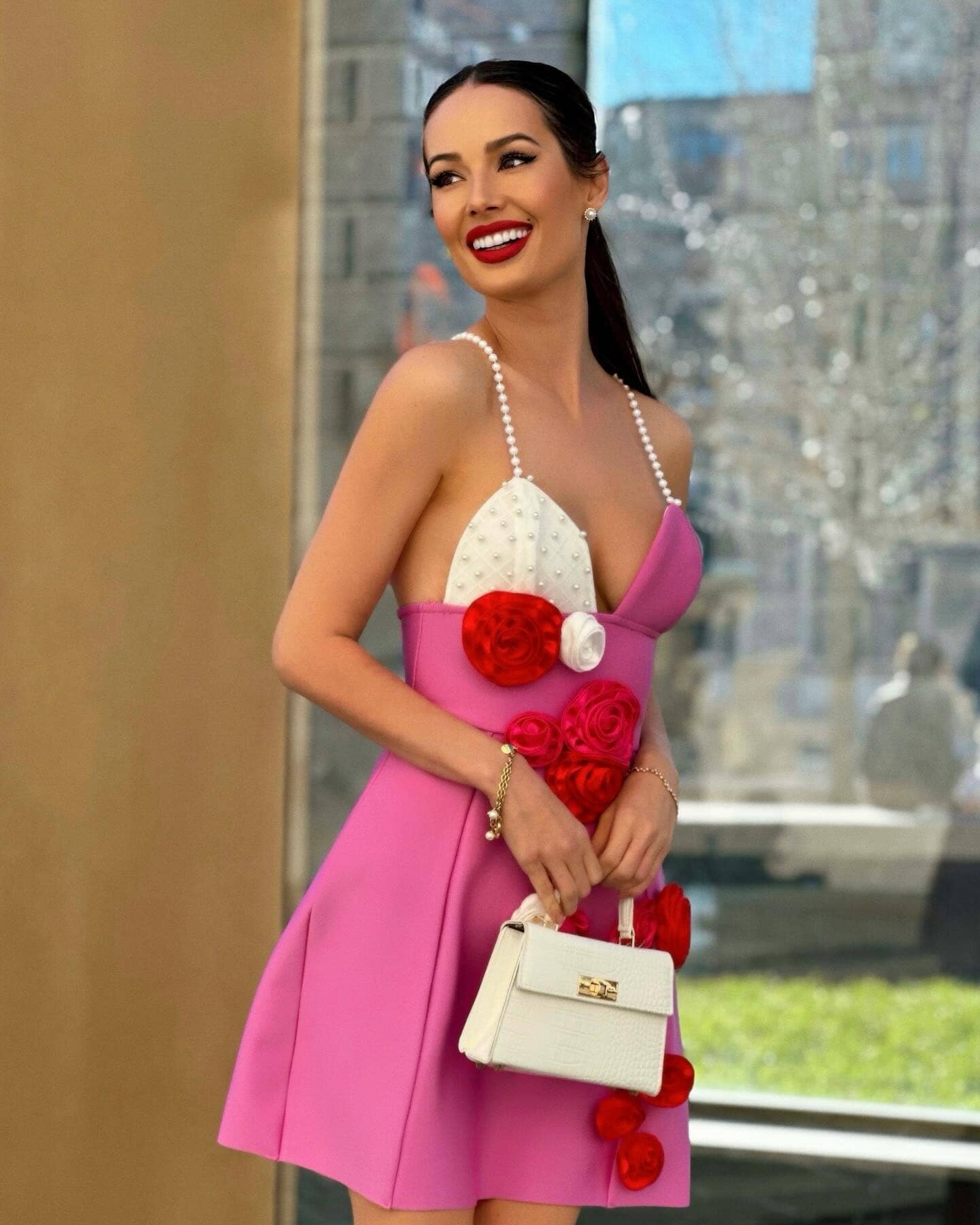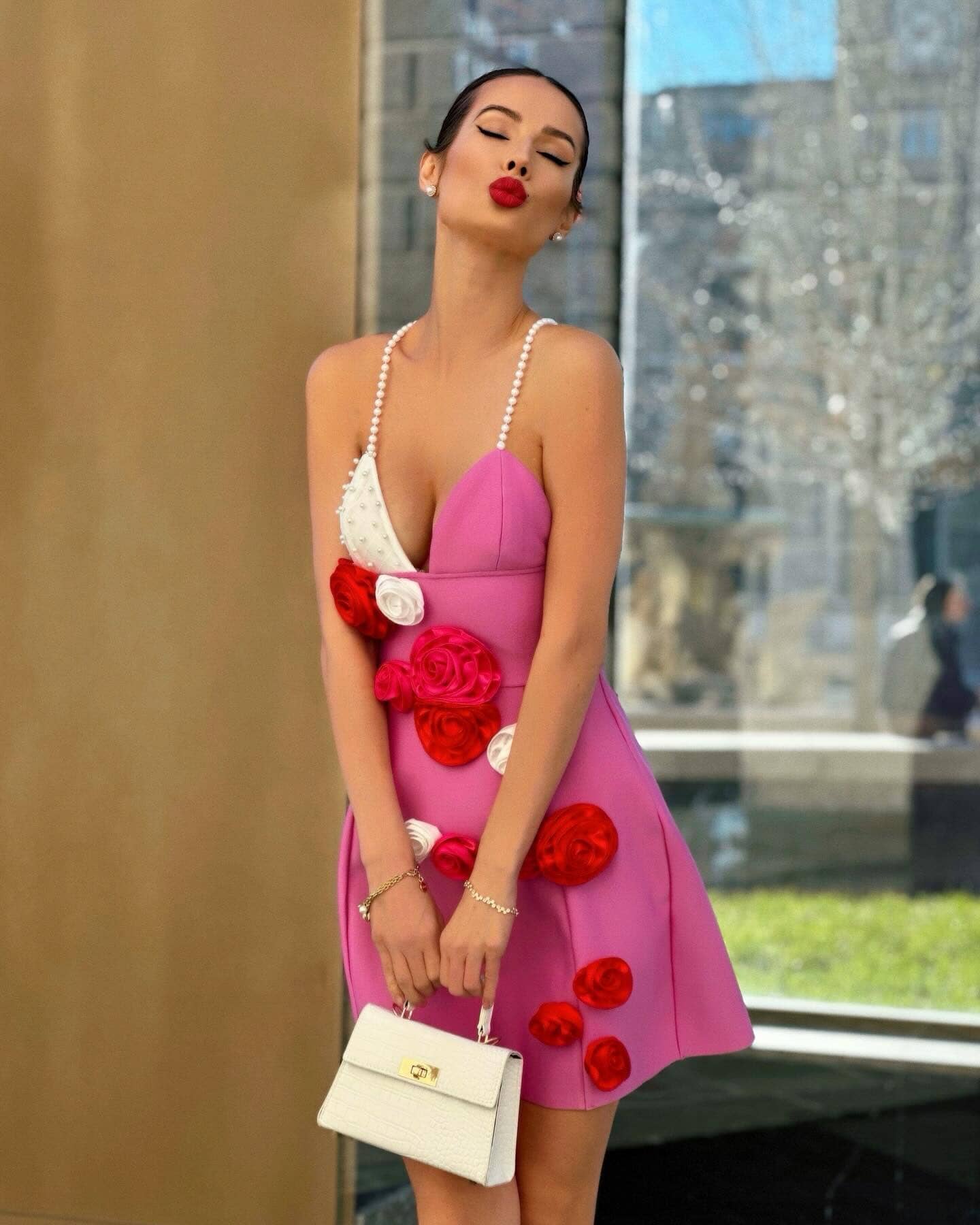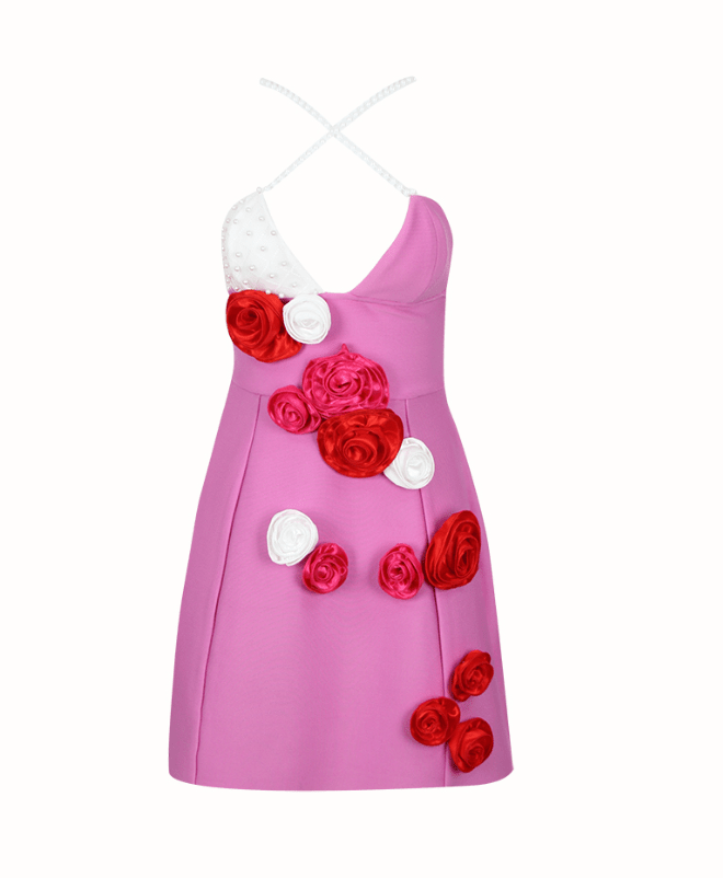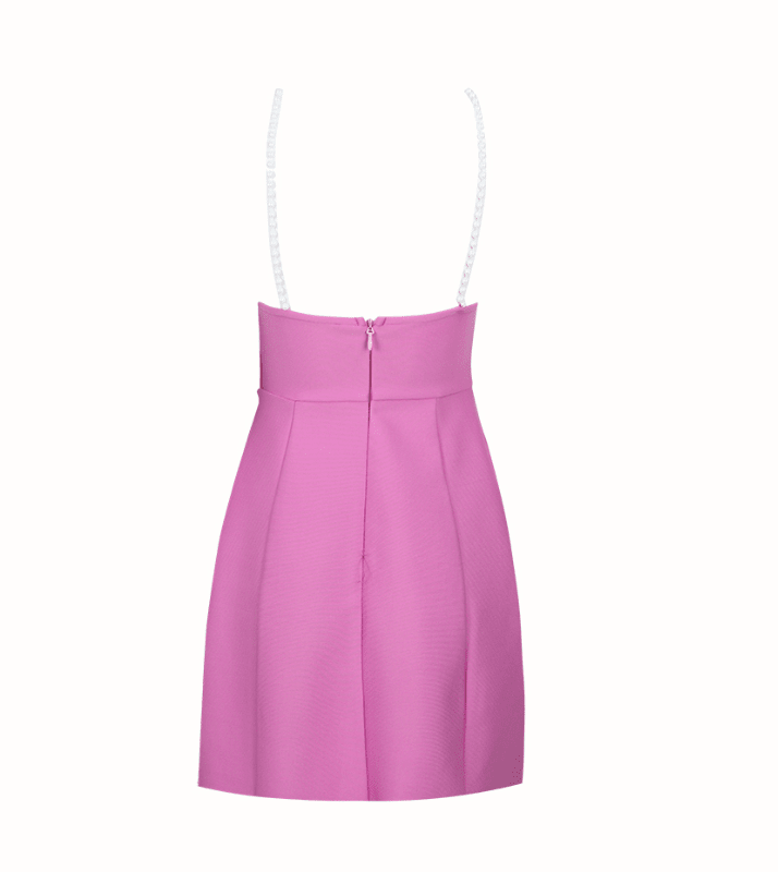 Make a statement with the Indiah Mini Dress. This luxurious pink dress features delicate pearl straps and a stunning flower detail for an elegant touch. Perfect for any special occasion, this dress will make you feel like a work of art. Show your sophisticated and exclusive style with the Indiah Mini Dress.