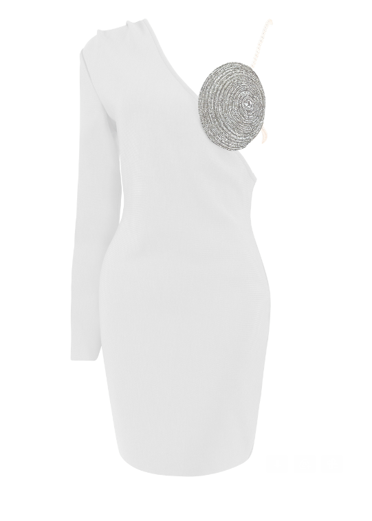 Get ready to be the center of attention in our Irma mini dress. Featuring a rhinestone bralette and a single sleeve for extra sexiness.