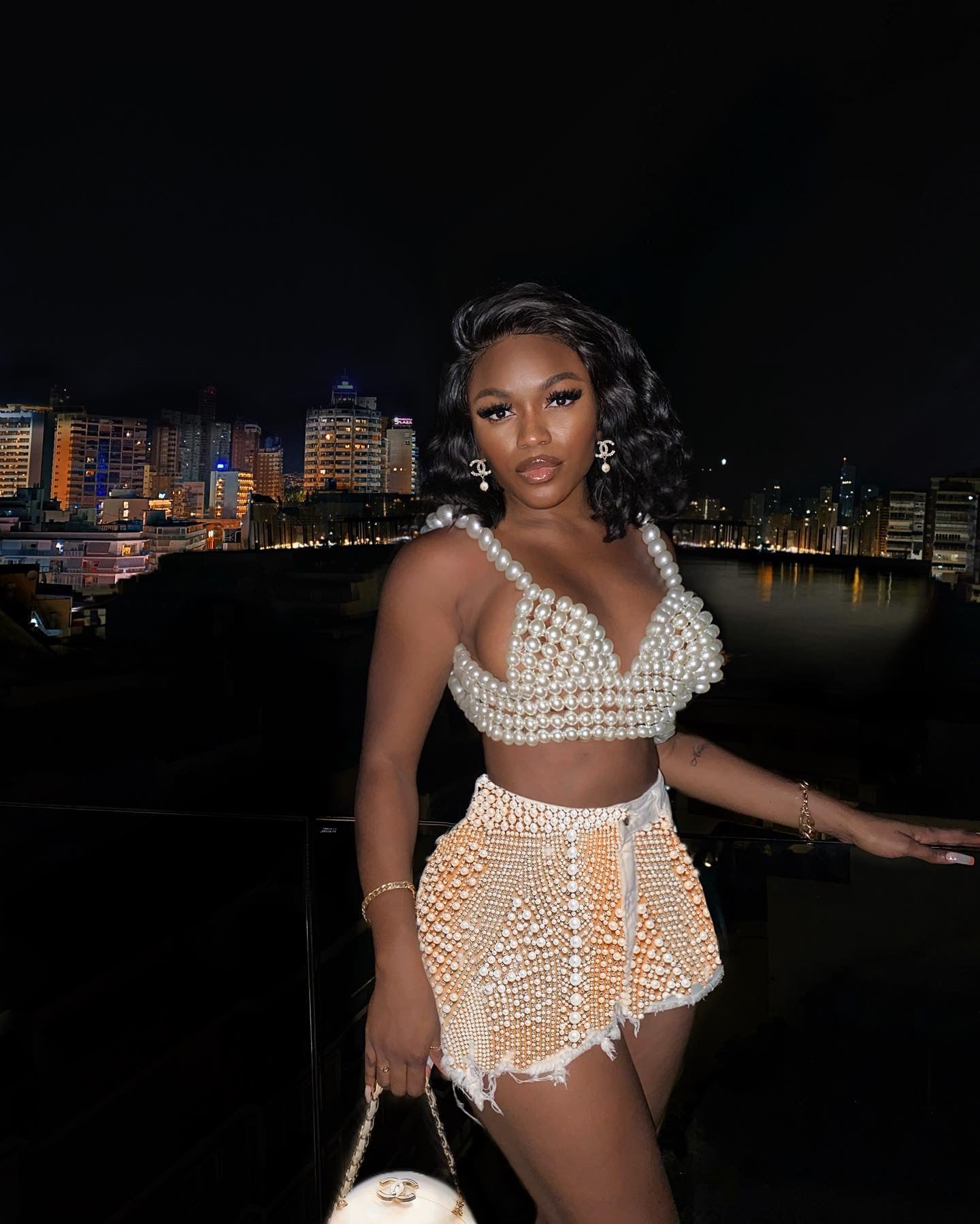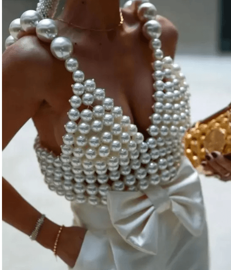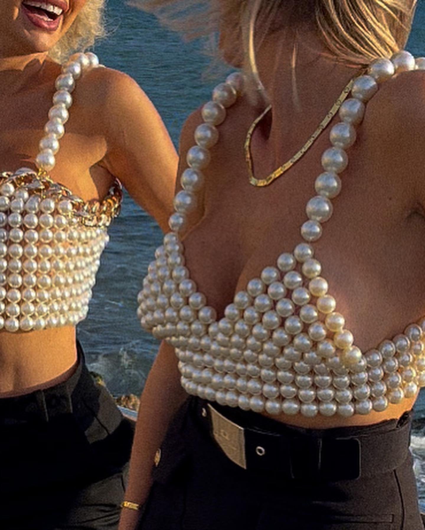 Add a new hero top to your wardrobe. This pearl bralette statement piece might just make your other party tops look a little boring. Featuring oversized layered pearls and chain details. Layer over your favourite dress or team it with straight leg jeans and stacked jewellery.
