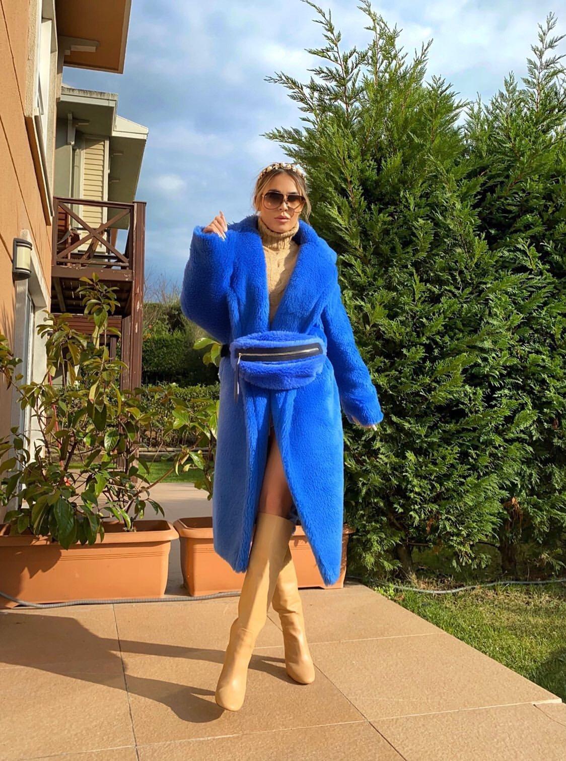 The Jasmine Teddy coat is a must have for the winter months! This mid-length coat is guaranteed to keep you warm while looking trendy! The coat comes with faux fur belt bag for a chic look! Style with jeans and sneakers and be ready to stand out in our Jasmine Blue Teddy coat.
