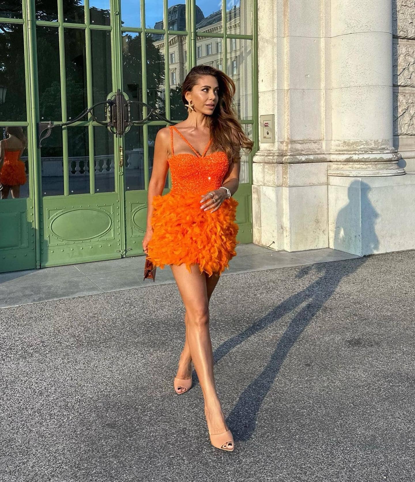 The Kaita Mini Dress is crafted from an exquisite orange corset style fabric, created for luxury and comfort, with a full feather skirt for ethereal movement and sparkling sequin detail on the top for an added touch of glamour. With its chic and elegant design, this exquisite dress is sure to make a statement.