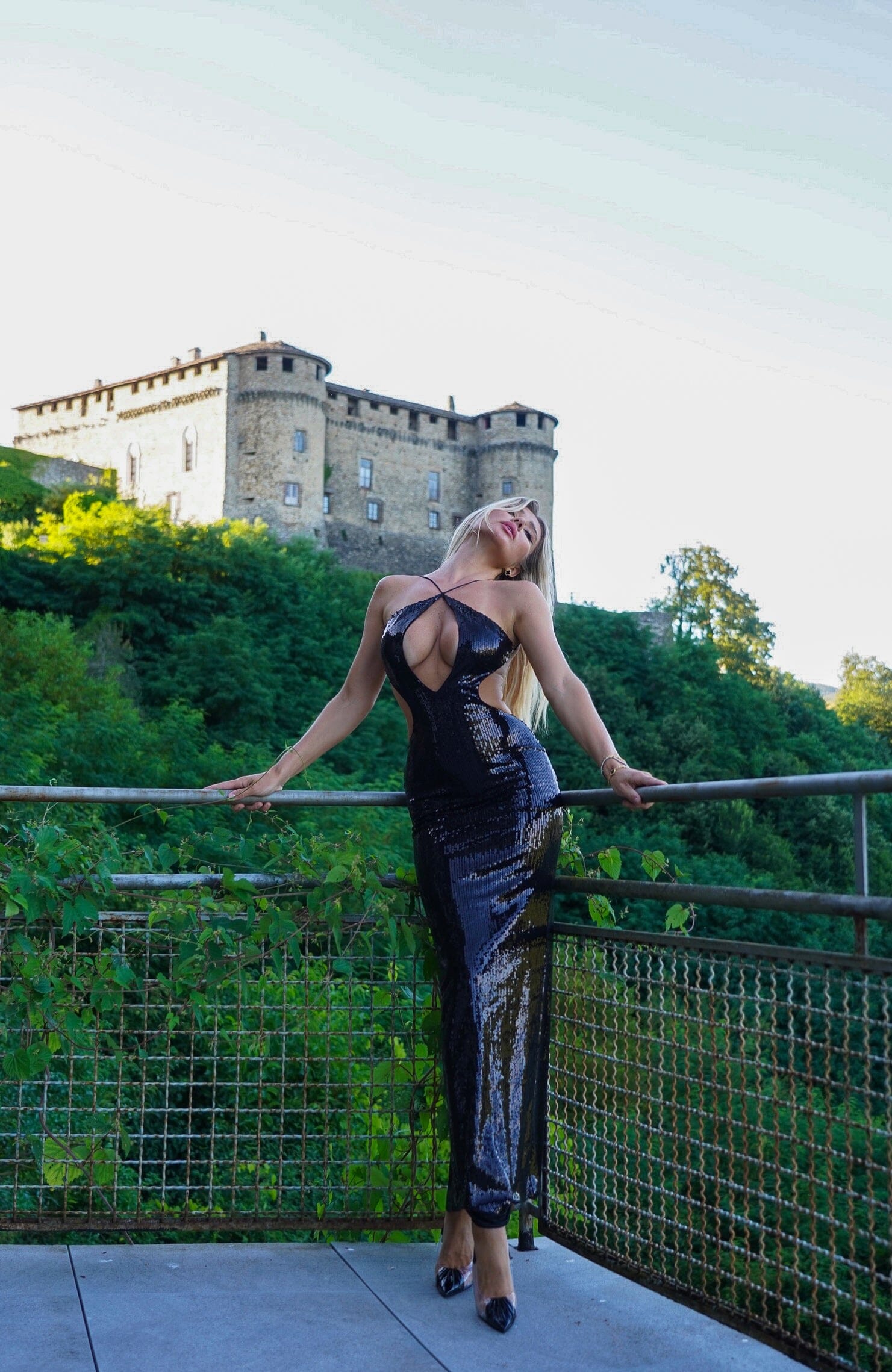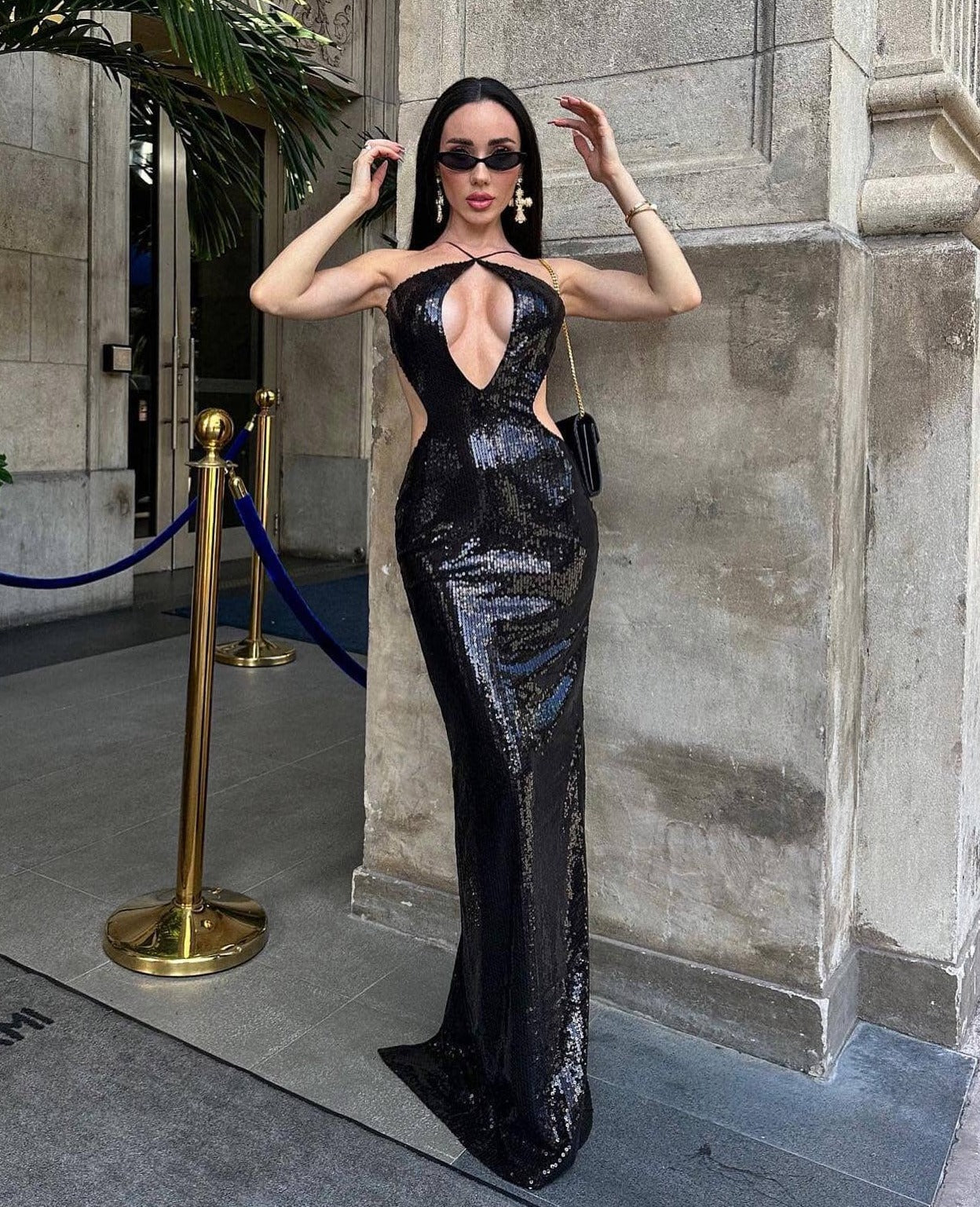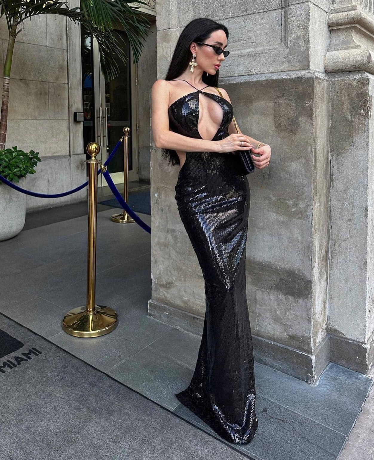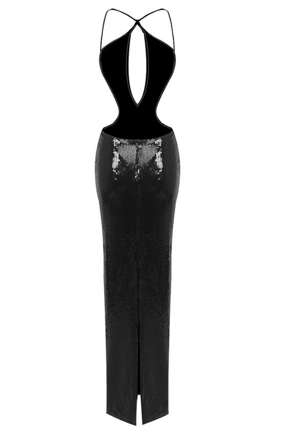 Make a sparkling statement in the Kanai Maxi Dress. Constructed from luxurious black sequins, this dress features a flattering open back and waist cutout, offering a glimpse of skin while maintaining its alluring sophistication. Perfect for your next night out.