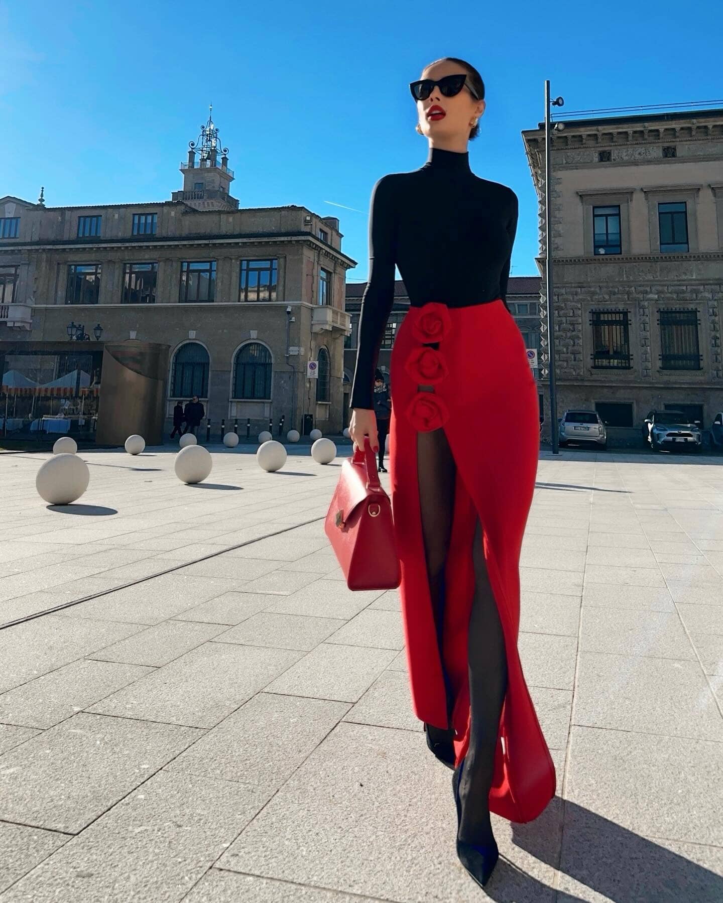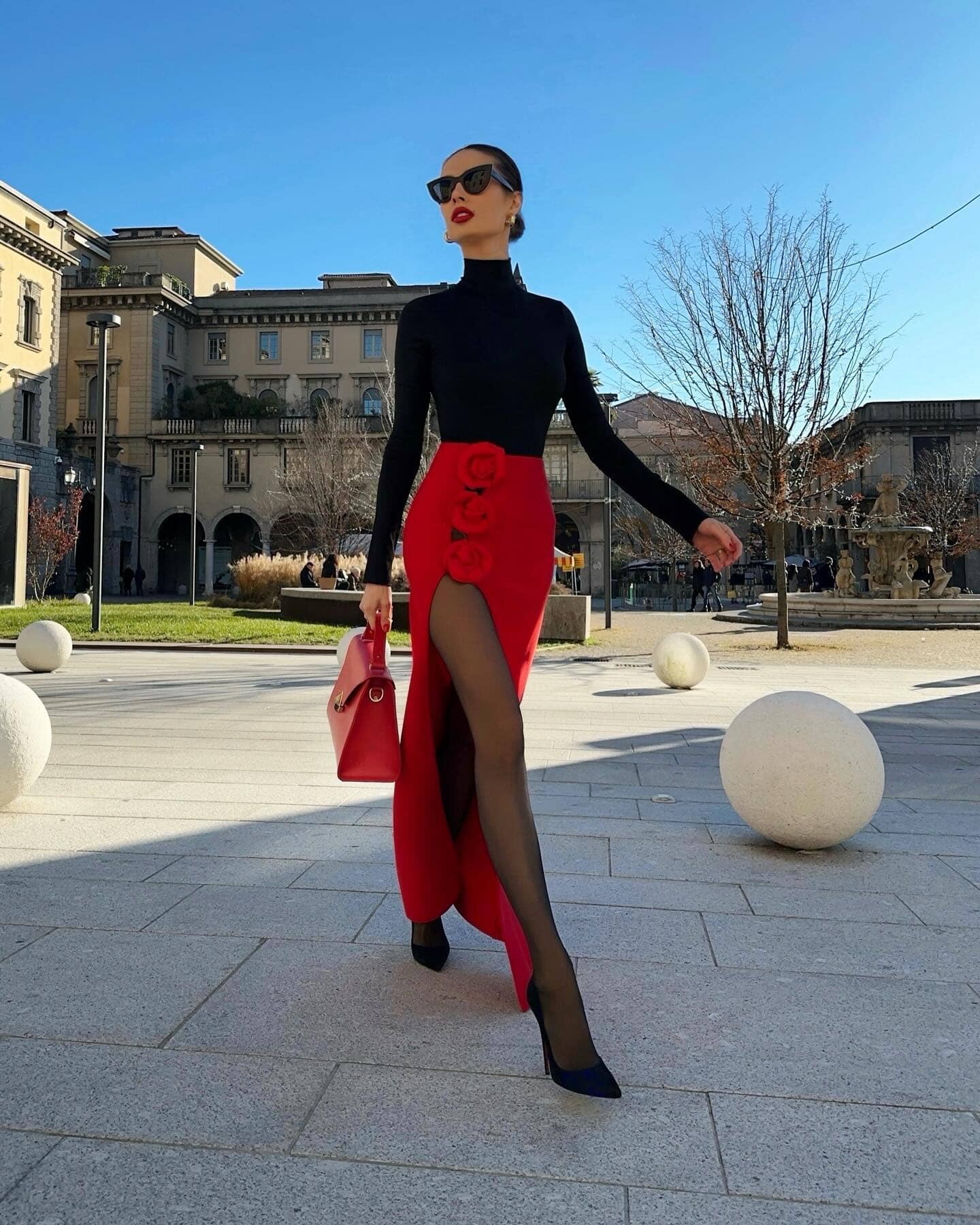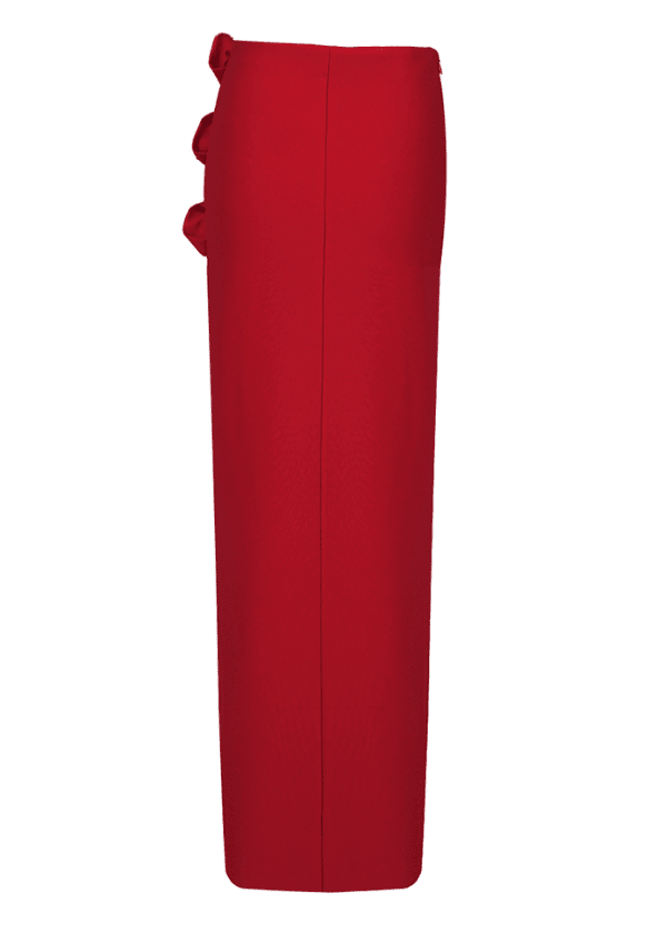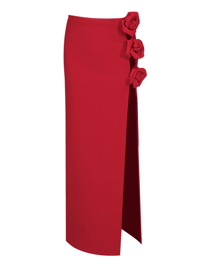 Wrap yourself in luxury with our Karyna Maxi Skirt. Crafted from the finest red fabric, this skirt features a daring thigh slit and intricate flower detailing, adding a touch of sophistication to any outfit. Elevate your wardrobe with this exclusive piece that exudes elegance.