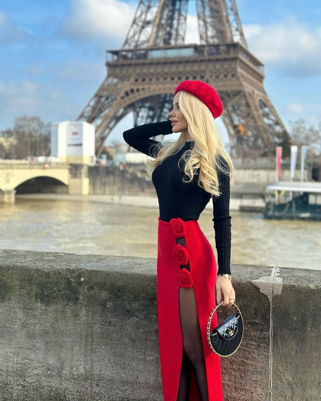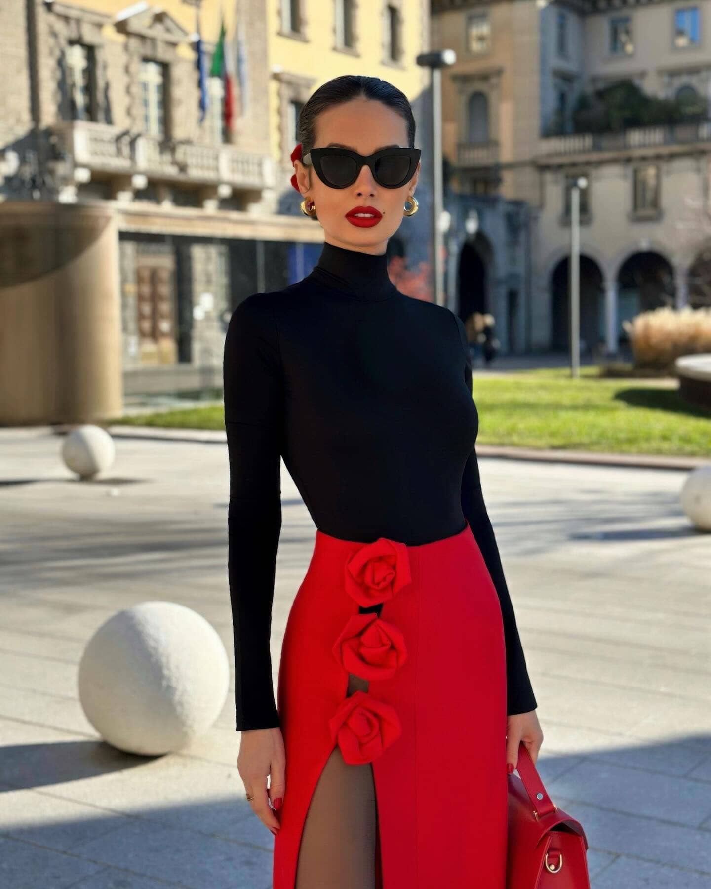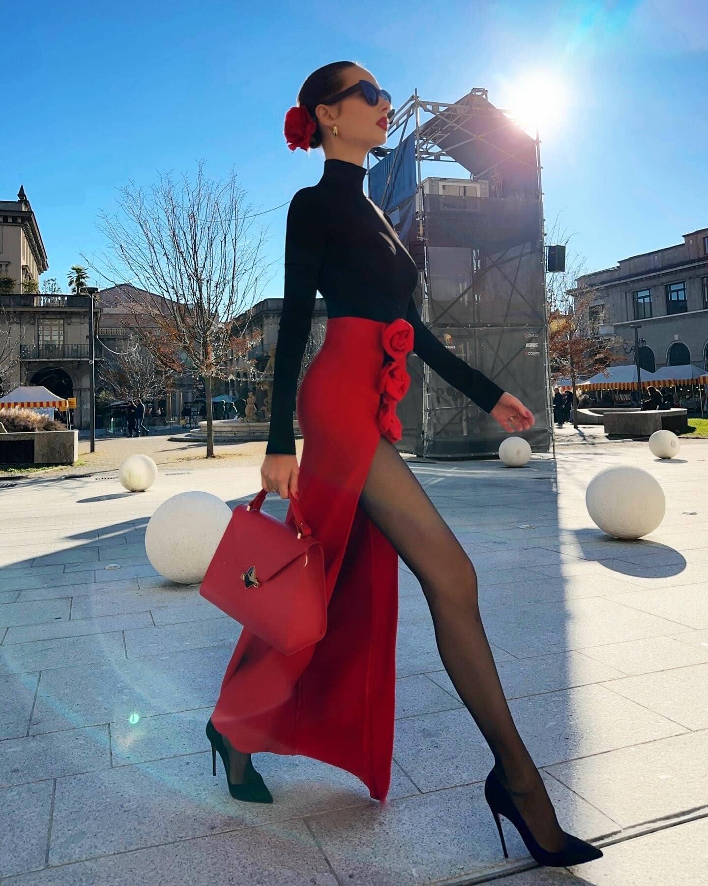 Wrap yourself in luxury with our Karyna Maxi Skirt. Crafted from the finest red fabric, this skirt features a daring thigh slit and intricate flower detailing, adding a touch of sophistication to any outfit. Elevate your wardrobe with this exclusive piece that exudes elegance.
