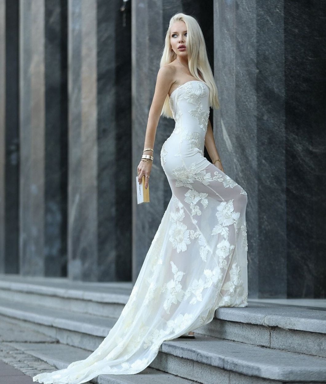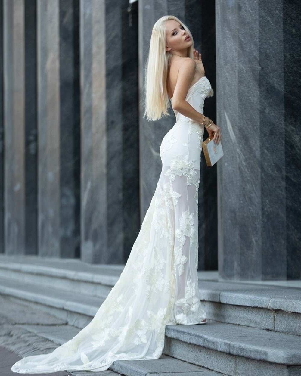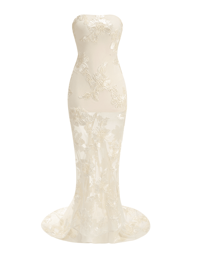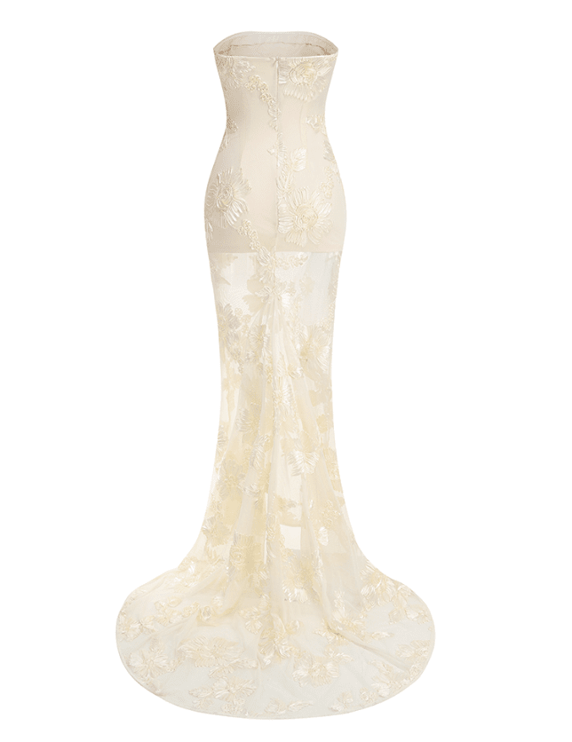 Embrace a luxurious look with our Katia Mxi Dress. Crafted with a delicate white floral print and a flowing train on the back, this strapless maxi dress exudes elegance and grace. Perfect for any occasion, this dress will make you feel like a work of art.
