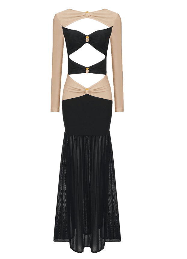 Discover a look of opulence with the Kedra Maxi Dress. Crafted with an intricate fusion of black and nude fabric, this dress is designed to flatter with chic front cutouts and pineapple accents for an extra touch of sophistication. Perfect for any special occasion, the Kedra Maxi Dress will elevate your style to effortlessly elegant heights.