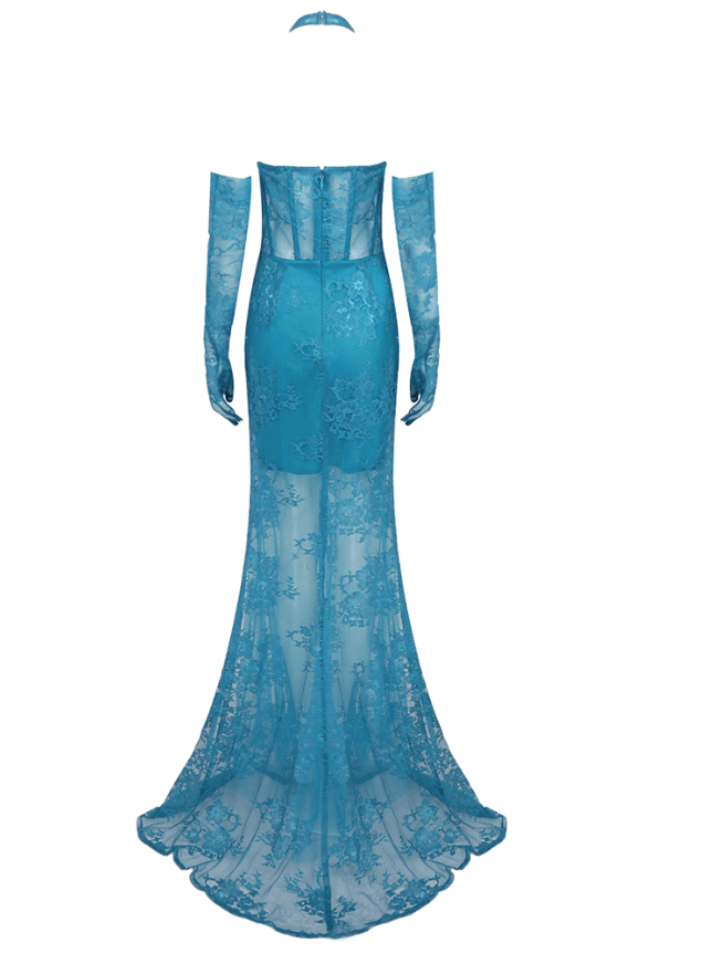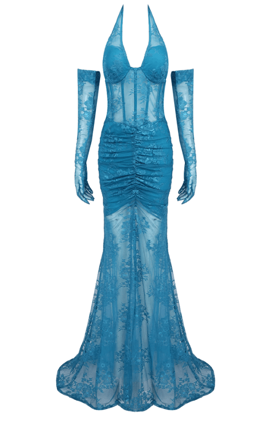 Elevate your stylish sophistication with the Kenia Maxi Dress. Crafted from luxurious blue lace, this dress features a halter neckline for a glamorous touch. Complete your elegant look with the included matching gloves. Perfect for special occasions and making a statement.