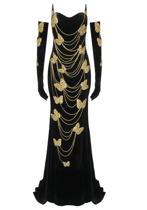 Make a statement in our exquisite Keti Maxi Dress. Crafted from luxurious black velvet, this figure-hugging piece features a decadent bustier-style bodice with ornate gold butterfly detail and comes complete with matching gloves. Perfect for special occasions, this timeless piece will ensure you look and feel glamorous from dusk till dawn.