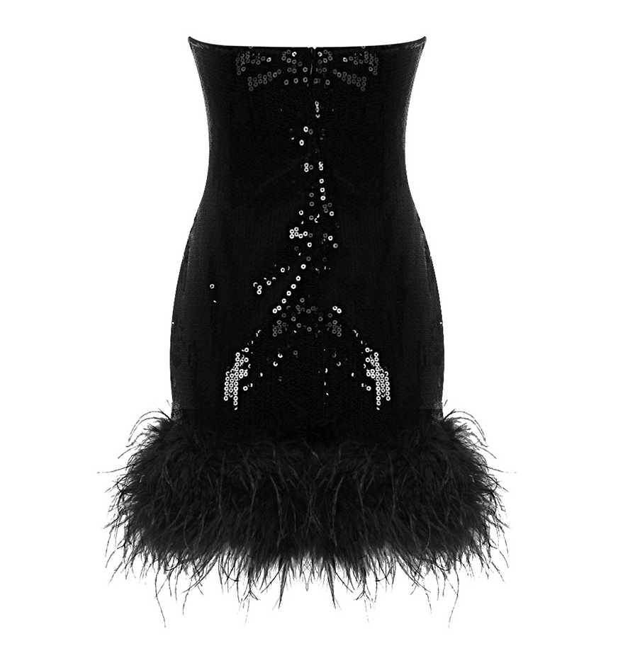 Make a statement with this dreamy Klea Dress. Featuring a black sequin material, ostrich feather hem, and a figure-flattering fit. Pair with gold accessories and high heels for a weekend worthy combo.