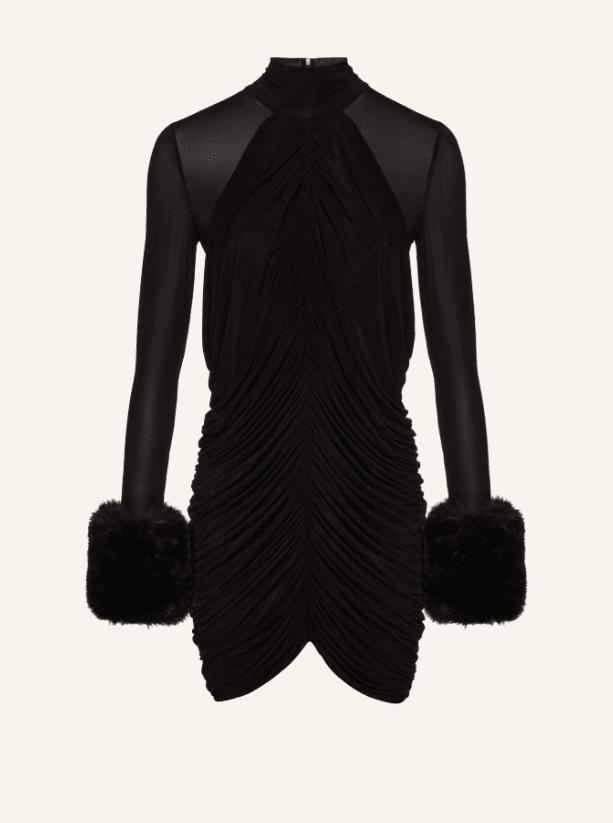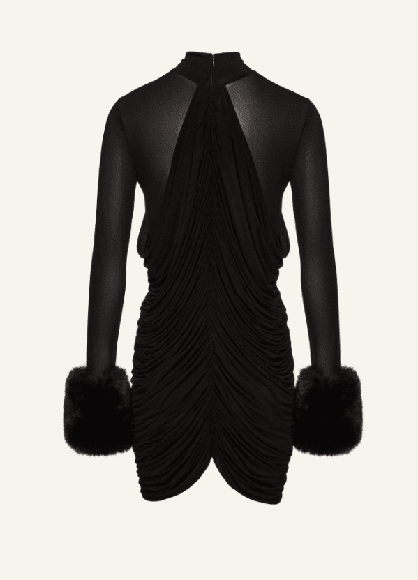 Indulge in elegance with our Krysten Mini Dress. This black dress boasts long and fluffy sleeves, a high neckline, and a mini length for a truly sophisticated look. Perfect for any special occasion, it adds a touch of luxury to your wardrobe.