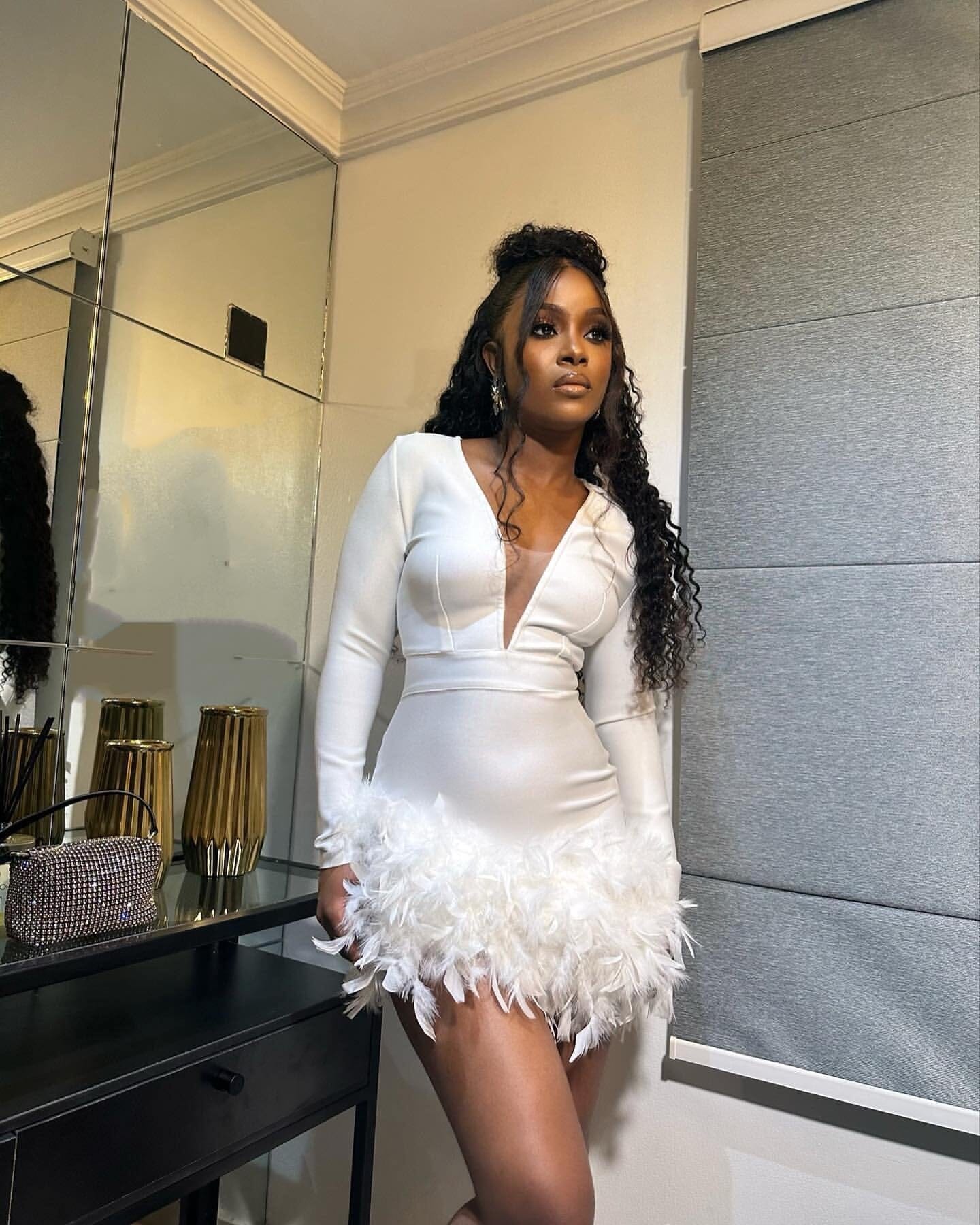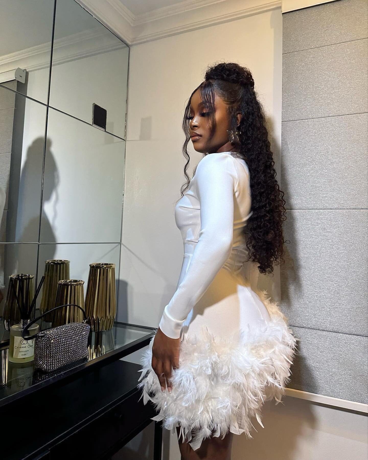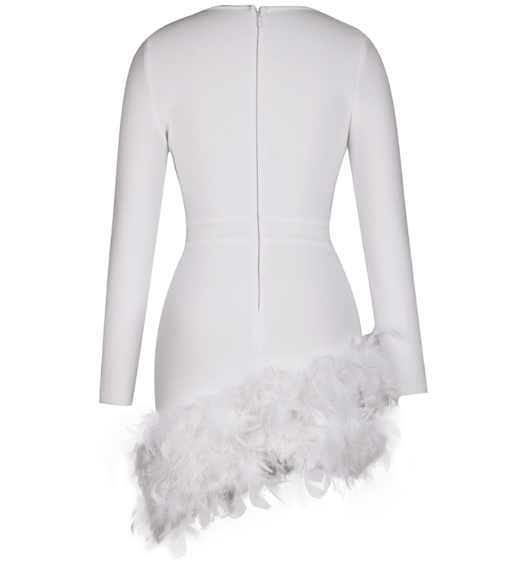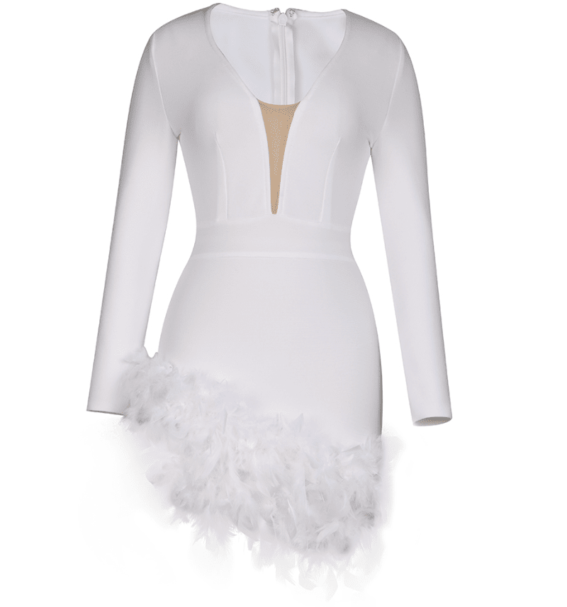 Ready to ruffle some feathers? Larija dress features a plunging neckline with mesh detail and flirty feather asymmetric hemline. Pairs well with heels and perfect for a night out.