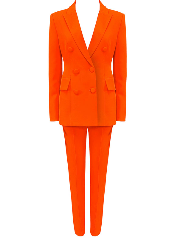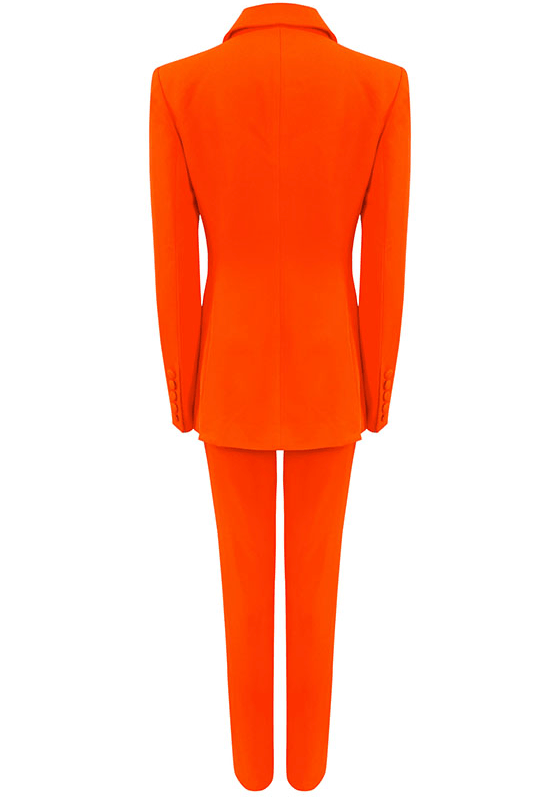 The Latoria two piece set is a must have for the season! Featuring an orange fabric, slim fit pants and a structured blazer. Style them with heels for a sophisticated look!