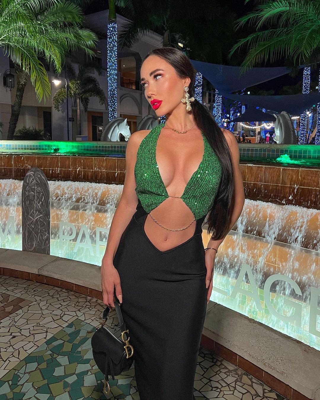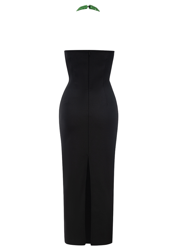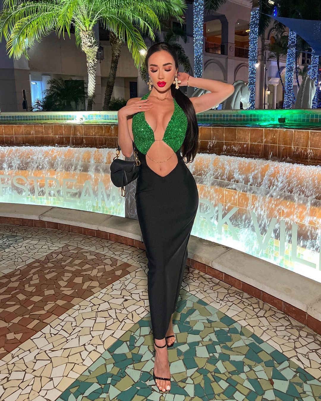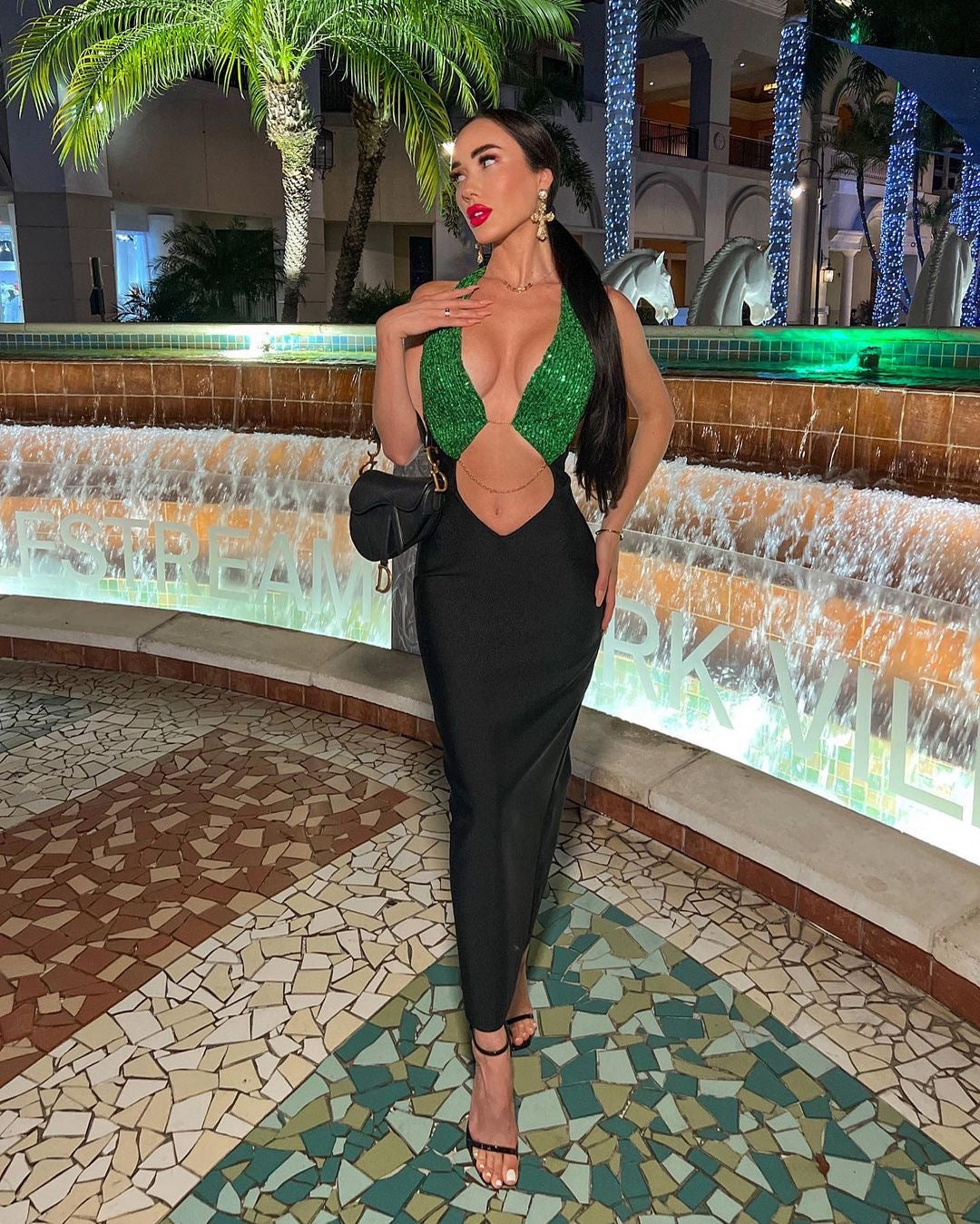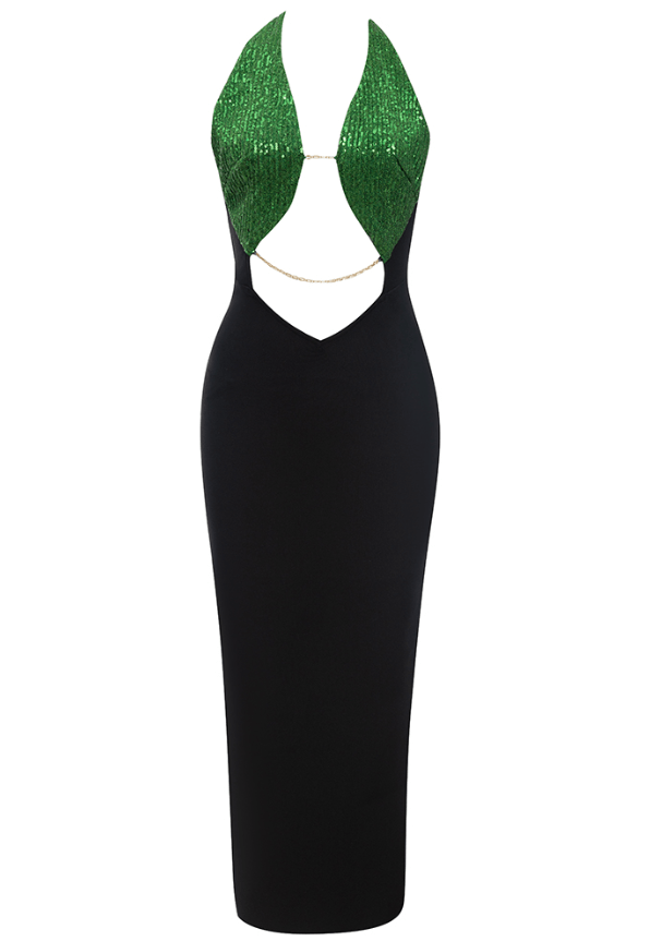 Get ready to stand out in our Lianni dress! Featuring a figure hugging fit in a beautiful green and black shade. Style with heels and a mini bag for a chic look!