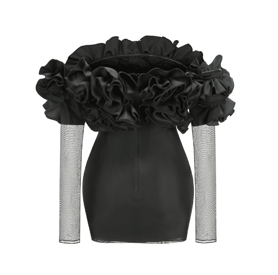 Indulge in pure luxury with our Lisandra Mini Dress. The classic black color and off-the-shoulder design exude elegance, while the oversized ruffled and mesh sleeves add a touch of drama. Perfect for making a sophisticated statement at any event.