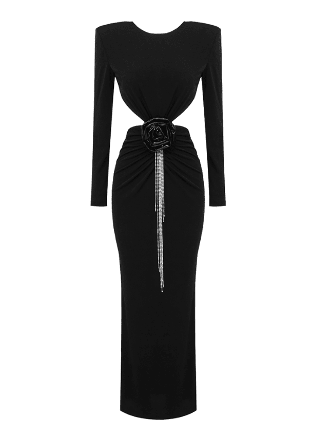 Glam up your look with ourLisbeth dress! featuring a waist cutout and open black with flower detail that will accentuate your waist beautifully. Style with heels and a mini bag for a glam look we're loving!