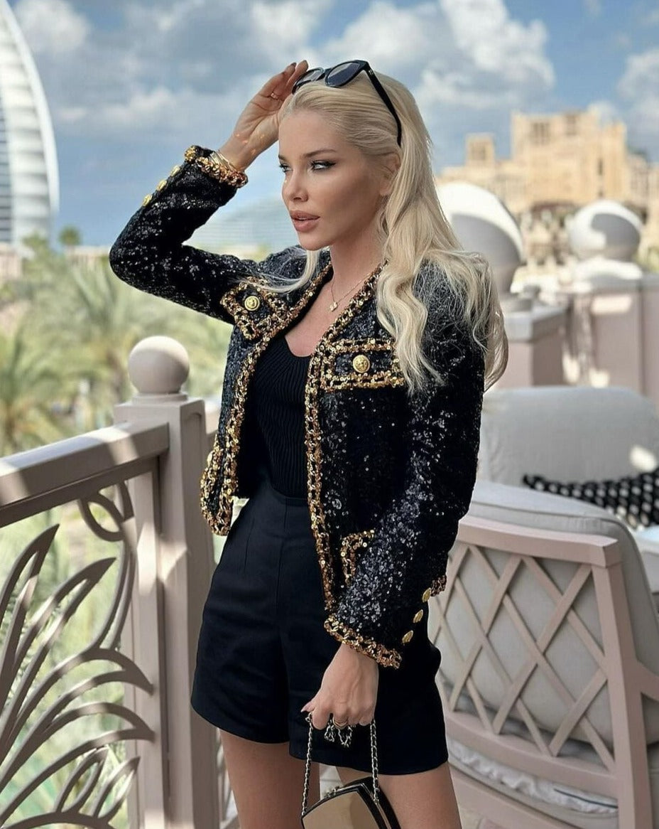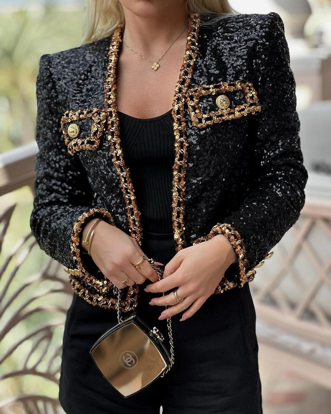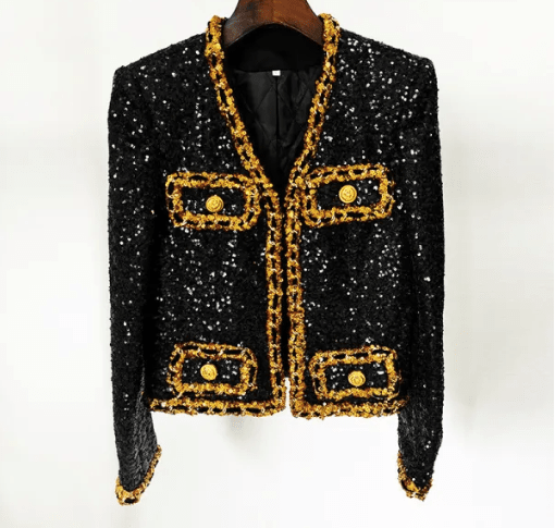 Introducing the Luiza Jacket - a statement piece that adds a touch of glam to any outfit. This sequin stunner boasts oversized gold buttons, elevating it to a luxury level. Show off your style with this elegant and exclusive jacket.